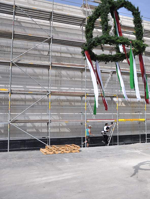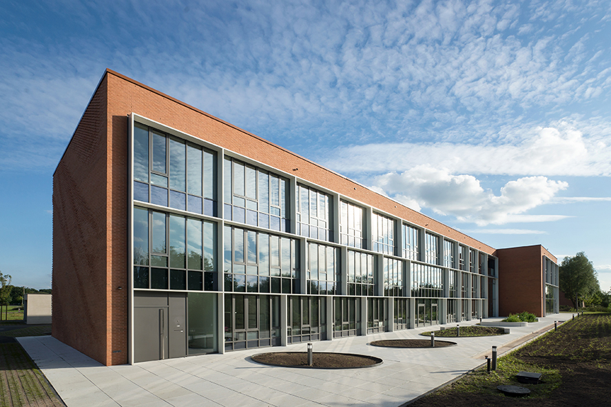 Die Fassade fasst den langgestreckten Baukörper zum Osten, Süden und Westen vollständig ein. Lediglich gen Norden öffnet sich der Neubau mit einer Glasfassade, die eine wunderschöne Aussicht in den angrenzenden Friedenspark mit seinem kleinen See bietet. Diese Ausrichtung schafft zugleich die Voraussetzungen für ein energetisch optimiertes Bürogebäude mit der Energieeffizienz eines KfW-Effizienzhaus 55 und einem Jahres-Heizwärmebedarfs von 76 kWh/m2a.