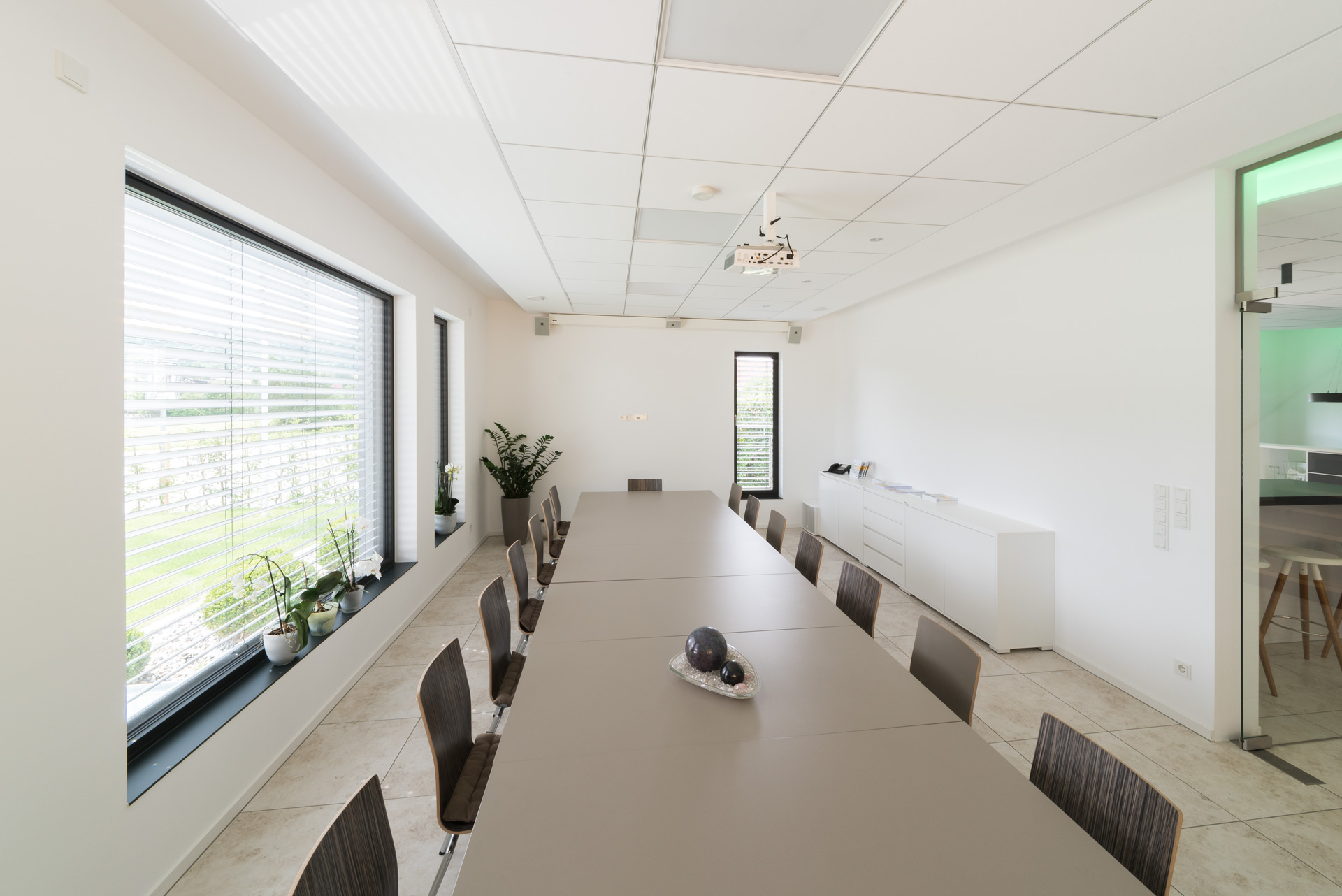 „Als Baubiologe standen für mich selbstverständlich auch natur – und umweltfreundliche Aspekte im Mittelpunkt der Planung und Ausführung“, berichtet Mario Netter weiter. „Zum Beispiel bestehen sämtliche Innen- und Außenwände aus Kalksandstein, System KS-QUADRO E, dessen Inhaltsstoffe nur die natürlichen Rohstoffe Kalk, Sand und Wasser sind. Als Bodenbeläge wurden für den Eingangsbereich Naturstein-Fliesen, für das Obergeschoss Eiche geölt und für alle Mitarbeiter-Büros schadstofffreie Teppiche gewählt. Die Innenraumluftqualität ist durch emissionsarme bzw. -freie Baustoffe in Anlehnung an das Konzept des Freiburger Sentinel-Haus-Instituts optimiert. Kalksandstein ist absolut emissionsfrei und wirkt darüber hinaus feuchteregulierend, was ein gesundes und angenehmes Raumklima zur Folge hat.“