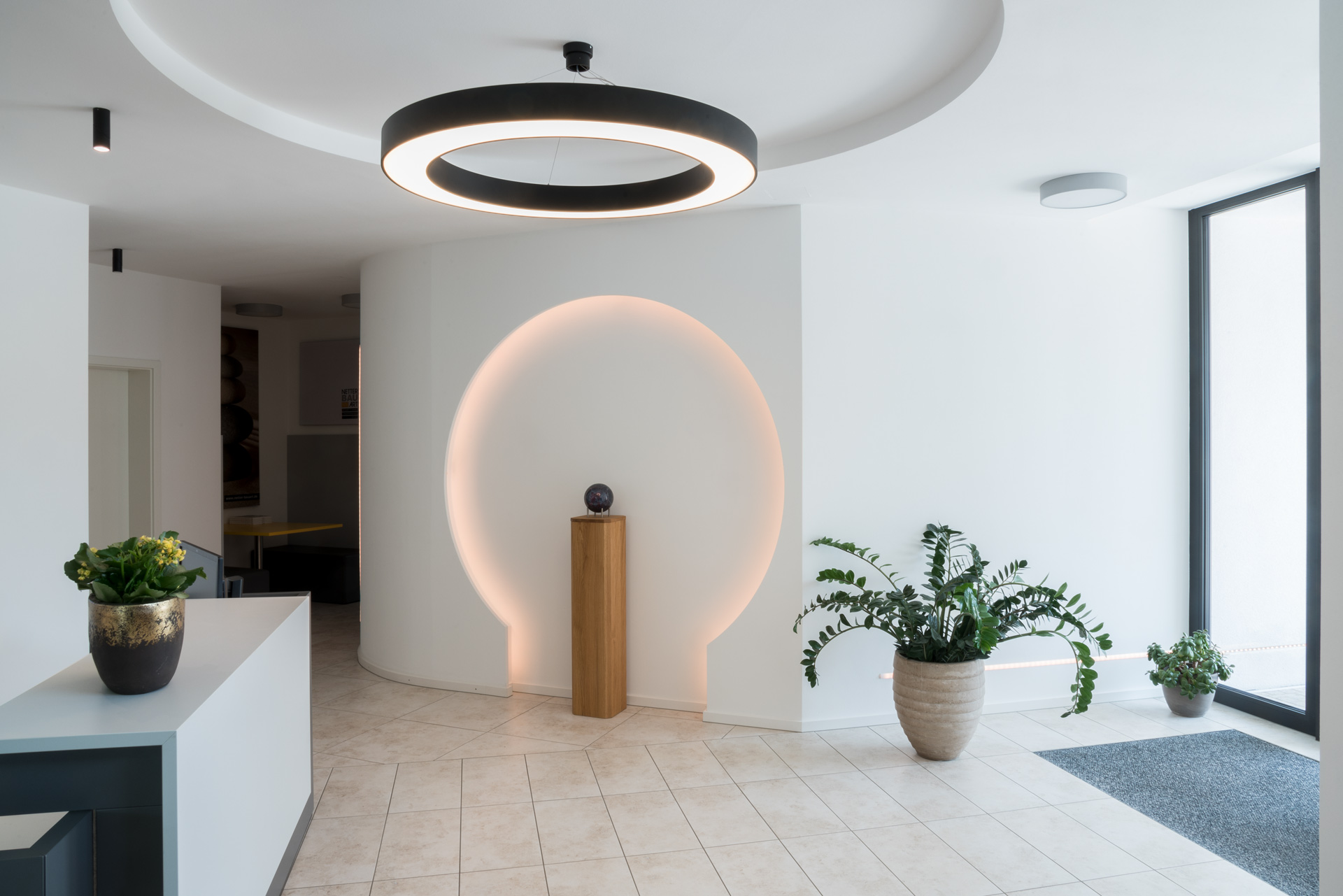 Angenehm inspirierend erhält man durch die geschwungene Linienführung im Foyer einen ersten Eindruck vom Raumgefüge, beruhend auf den Elementen der chinesischen Feng-Shui-Lehre. Die Gestaltungsprinzipien sind ausgelegt auf Harmonie, Erfolg und Glück und wurden von Mario Netter in mehreren Bereichen des Gebäudes berücksichtigt und umgesetzt.
