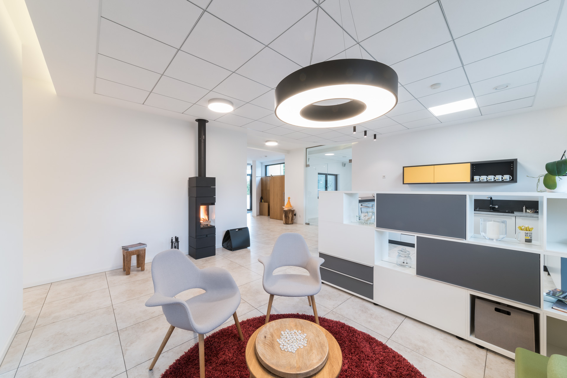 Das neue Geschäftsgebäude ist Verwaltungsbau und zugleich auch ein Haus für Besucher und Kunden. Die großzügige Eingangshalle dient als Empfangs- und Repräsentationsbereich - und stimmt die Besucher auf das Thema „Wohnbehaglichkeit“ ein.