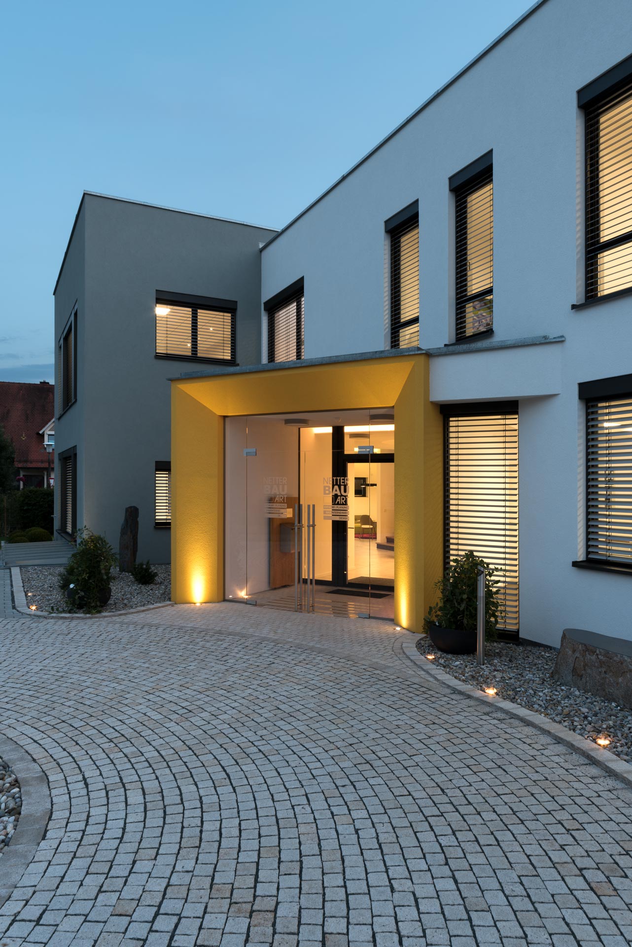 „Unser zweistöckiger Verwaltungsbau ist Aushängeschild und Imageträger unserer Firma“, berichtet Mario Netter. „Seine repräsentative Wirkung entfaltet das Gebäude bereits durch die Gestaltung des Eingangs. Seine gelbe Farbgestaltung und das dreieckige, um 45° zum Baukörper versetzte Portal wirkt deutlich als Eyecatcher und dient dadurch ganz selbstverständlich als Entree und vorgelagerte Kommunikationszone.“