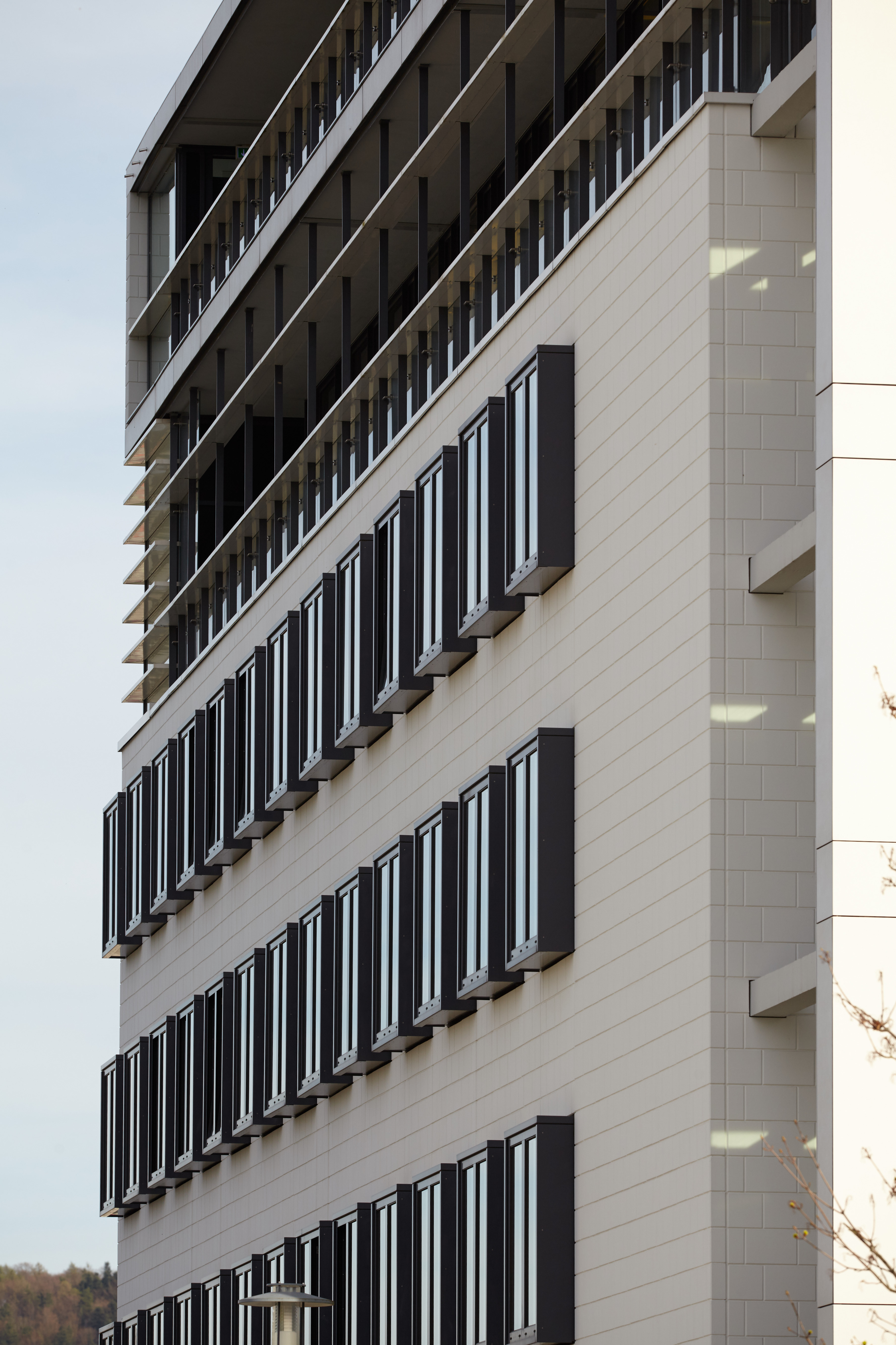 Vorspringende Fenster brechen geschickt mit der ansonsten flächigen Fassade des Gebäudes aus KS-Fasenstein.