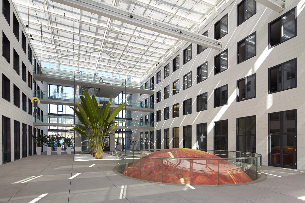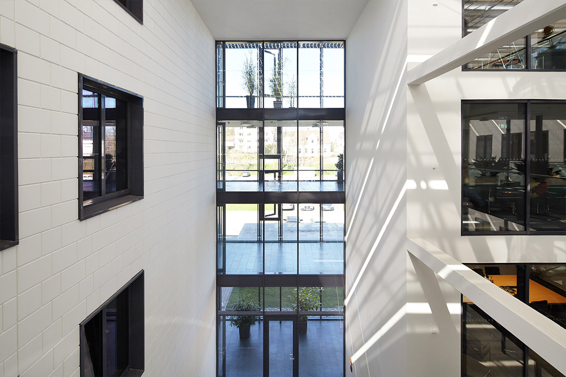 Großzügige, verglaste Innenhöfe verbinden die einzelnen Gebäudeflügel miteinander und dienen als Kommunikationsinseln.