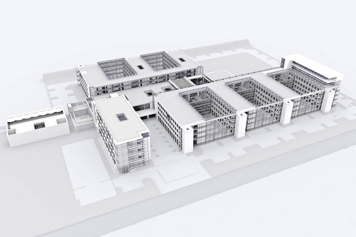 Die einzelnen Institute bestehen aus je drei Gebäuderiegeln, die durch verglaste Innenhöfe miteinander verbunden sind.