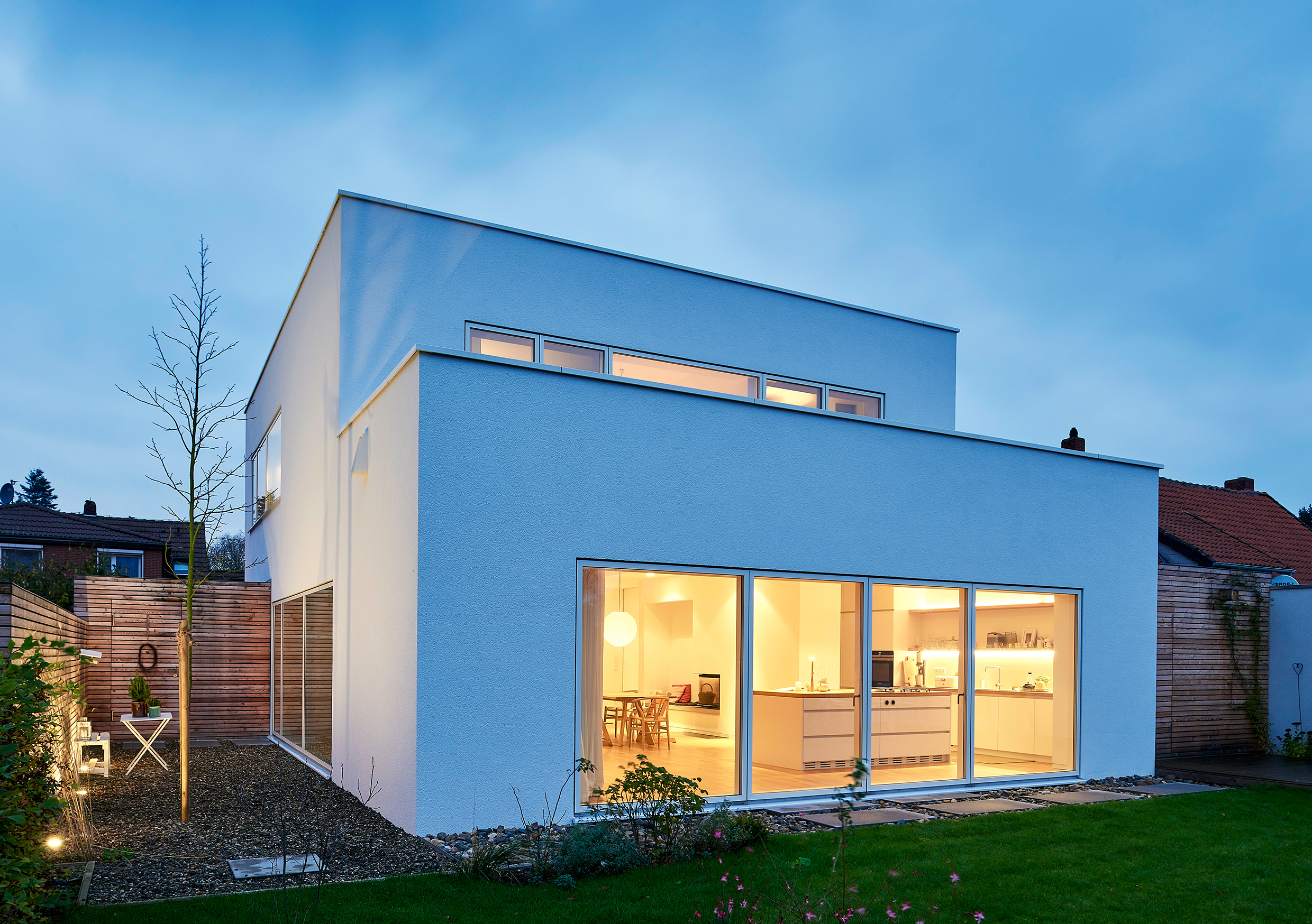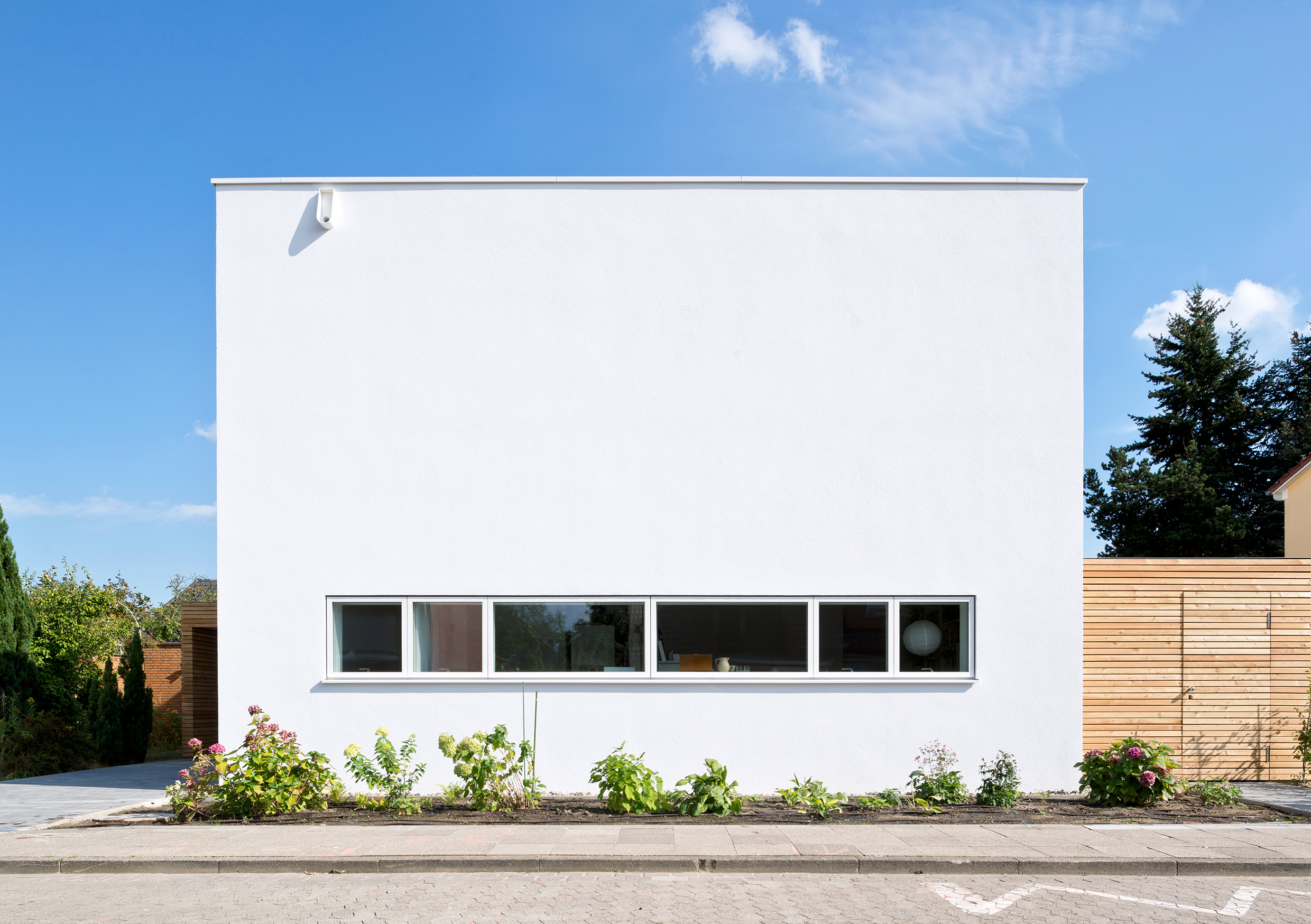In Hannover-Bothfeld haben saboArchitekten BDA ein Wohnhaus für eine fünfköpfige Familie realisiert. Stolz und kraftvoll wie ein weißer Monolith präsentiert sich das kompakte, zweigeschossige Gebäude in den Lahwiesen zwischen klassischen Einfamilien- und Reihenhäusern aus verschiedenen Bauperioden. Das kommunikative Zentrum des Hauses bildet ein großzügiger, offener Koch-Ess-Wohnbereich im Erdgeschoss, der nach oben durch einen Luftraum – eine Art Patio im Inneren – visuell und räumlich erweitert wird.