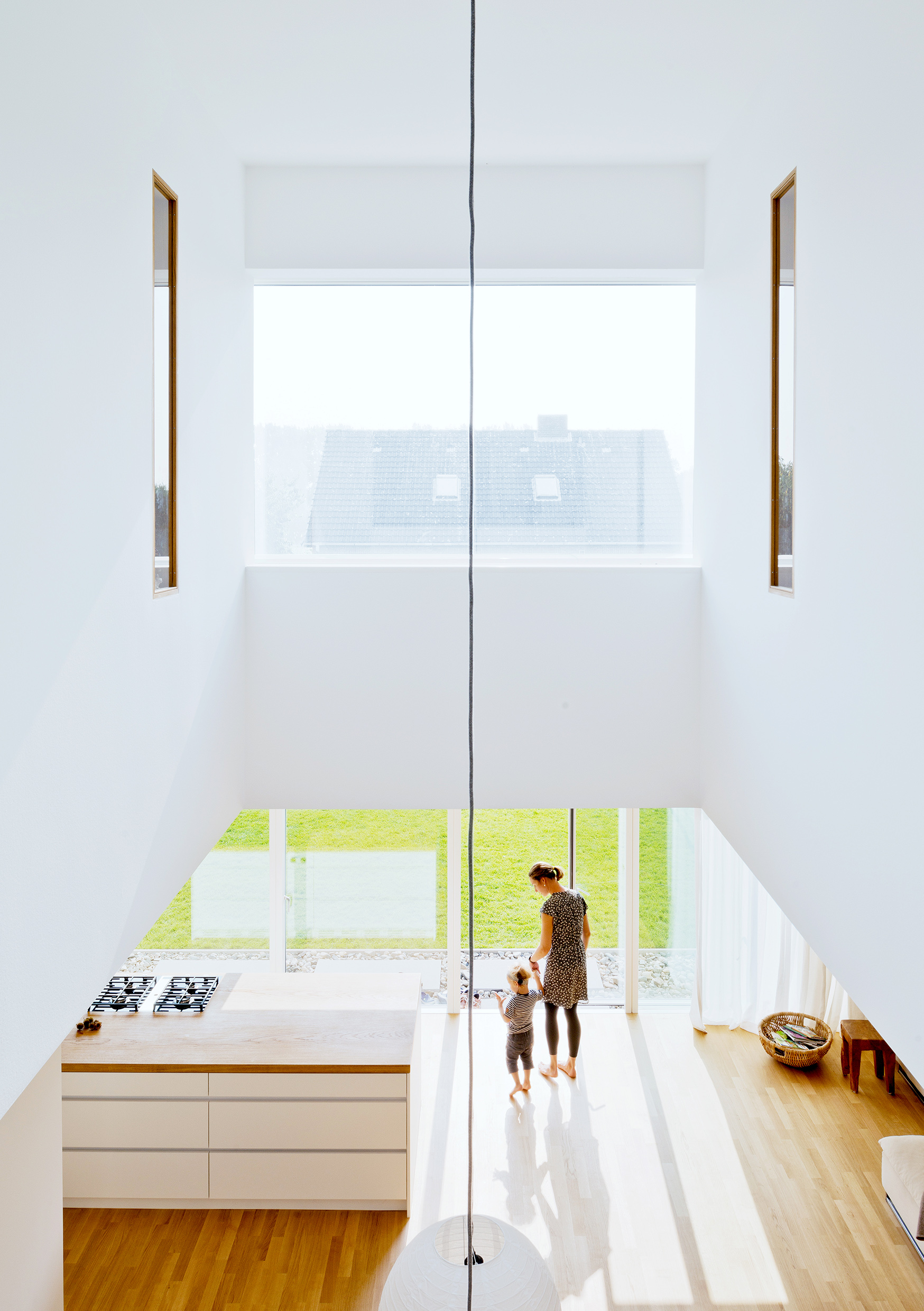 Ein großzügiger Luftraum über dem offenen Koch-Ess-Wohnbereich verbindet das Erdgeschoss mit den privaten Bereichen der Familie im Obergeschoss.