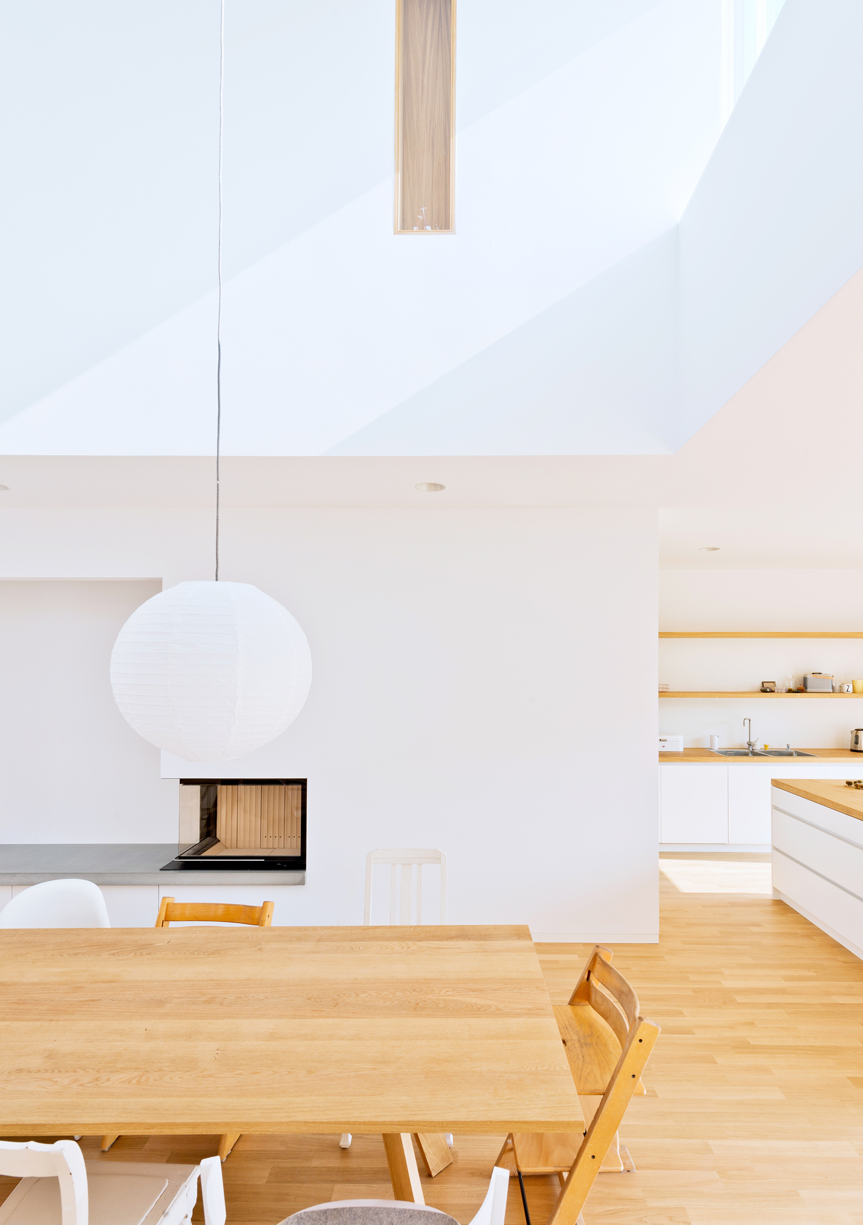 Die äußere Form des Wohnhauses ergab sich schließlich aus der Größe des vorhandenen Grundstücks, der umgebenden Bebauung und einer baurechtlichen Vorgabe. „Das Obergeschoss durfte maximal zwei Drittel der Grundfläche der Erdgeschossfläche in Anspruch nehmen. Wir mussten also kompakt bauen und jeden Quadratmeter optimal ausnutzen. Dabei haben wir dennoch versucht, vor allem durch den Luftraum über dem Essbereich eine maximale Grosszügigkeit im Inneren zu erreichen.“