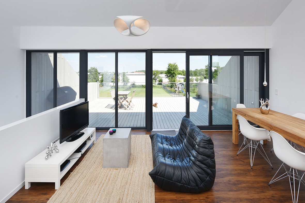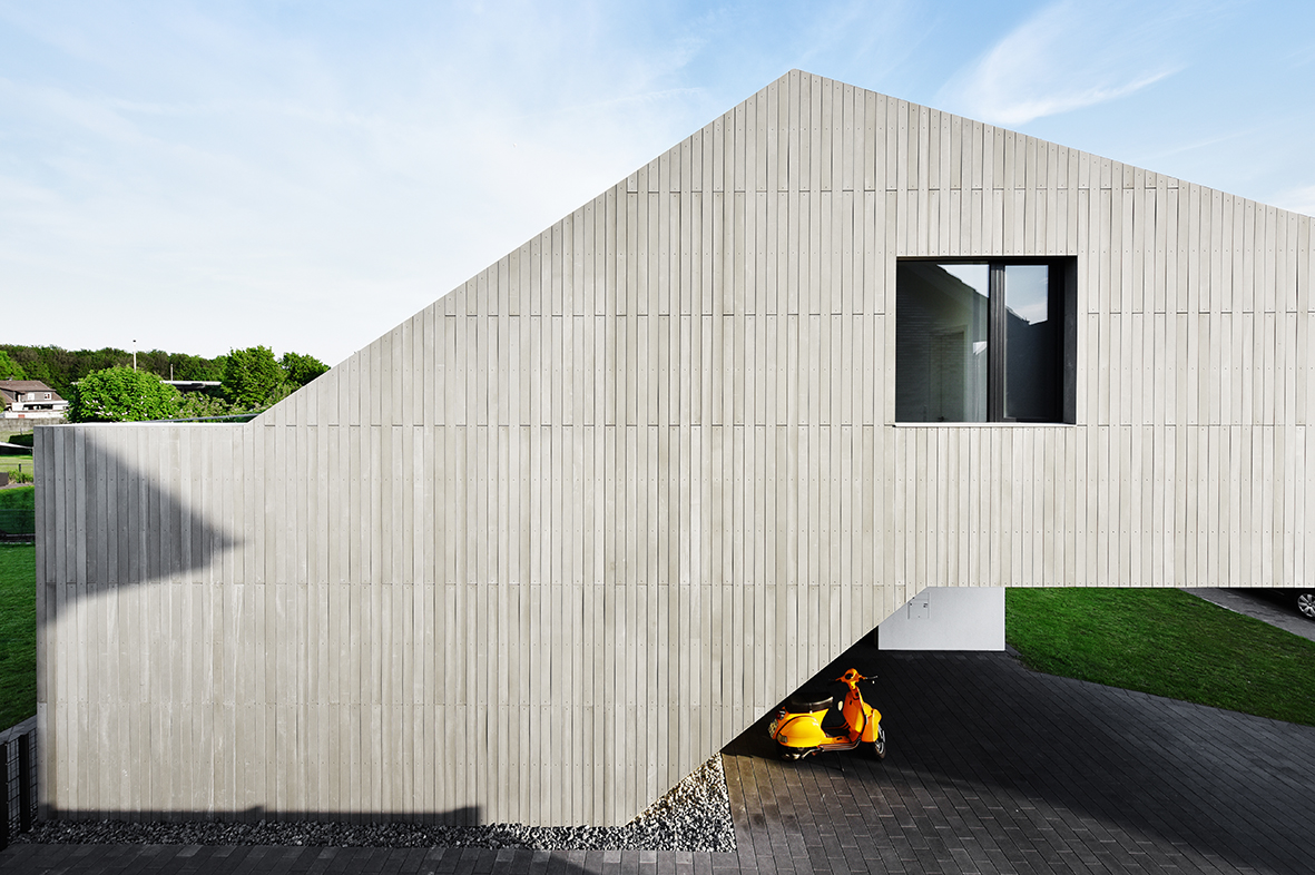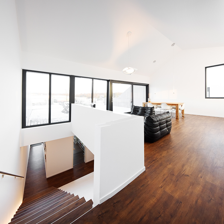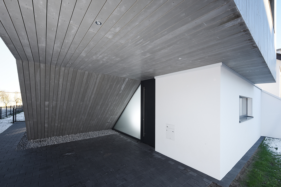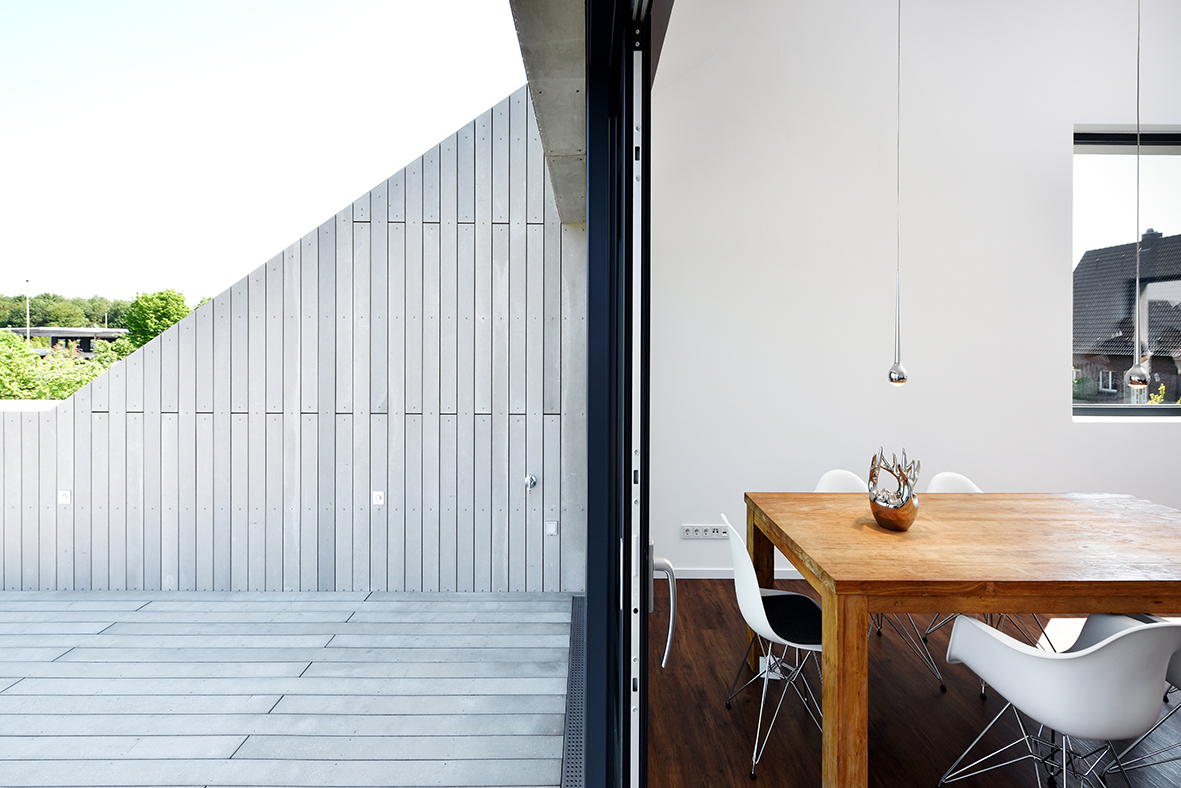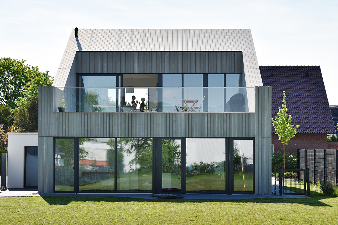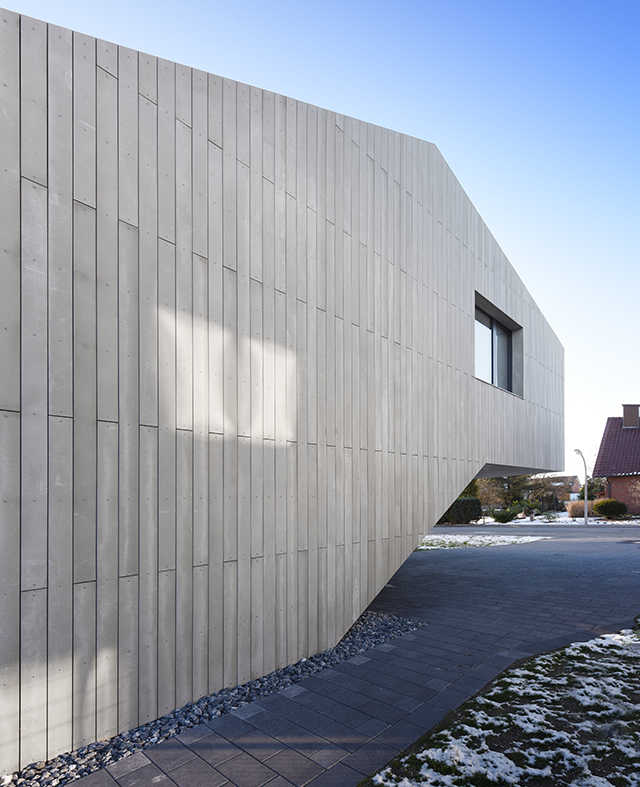 „Das Spiel mit dem Volumen gibt dem Haus eine einzigartige Leichtigkeit“, sagt Oliver Spiekermann, Architekten Spiekermann, Beelen, über das schnörkellos moderne Haus, das aus einem als Kubus ausgebildeten Sockelgeschoss und dem darauf aufliegenden zentralen Hauptkörper besteht. Geprägt wird er durch senkrecht montierte zementgebundene Holzfaserplatten, die ihn in Gänze umschließen. Auch Dachflächen und die Dachterrasse sind damit versehen. Um die puristische Wirkung nicht zu stören, wurden selbst Fall- und Regenrohre in die Vorhangfassade integriert.