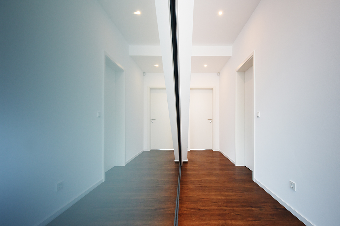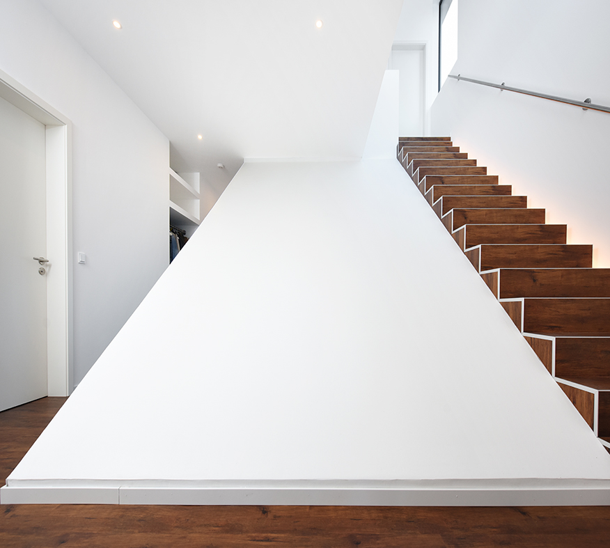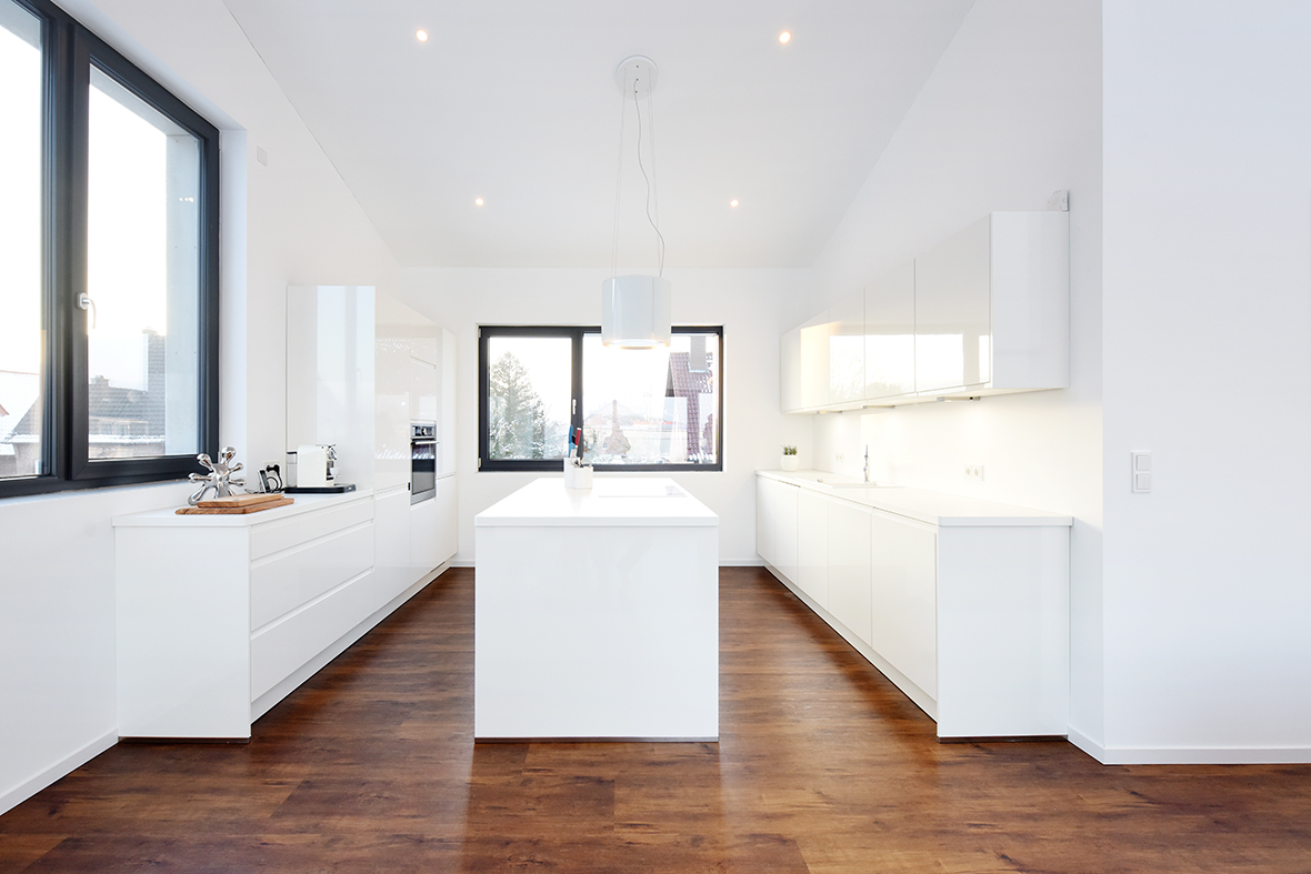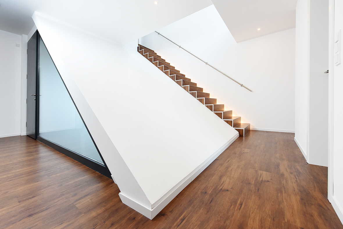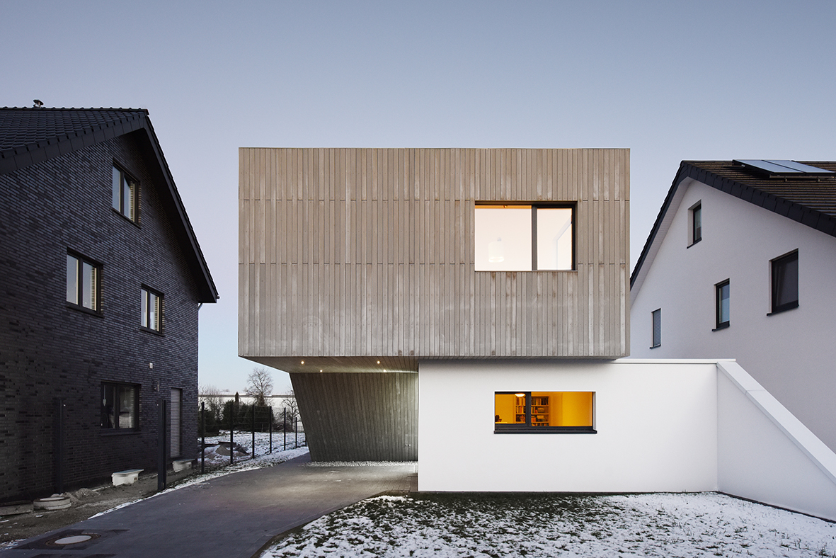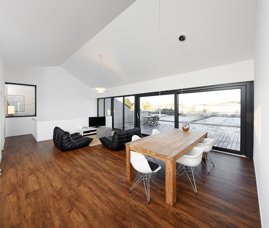 „Das Spiel mit dem Volumen gibt dem Haus eine einzigartige Leichtigkeit“, sagt Oliver Spiekermann, Architekten Spiekermann, Beelen, über das schnörkellos moderne Haus, das aus einem als Kubus ausgebildeten Sockelgeschoss und dem darauf aufliegenden zentralen Hauptkörper besteht. Geprägt wird er durch senkrecht montierte zementgebundene Holzfaserplatten, die ihn in Gänze umschließen. Auch Dachflächen und die Dachterrasse sind damit versehen. Um die puristische Wirkung nicht zu stören, wurden selbst Fall- und Regenrohre in die Vorhangfassade integriert.