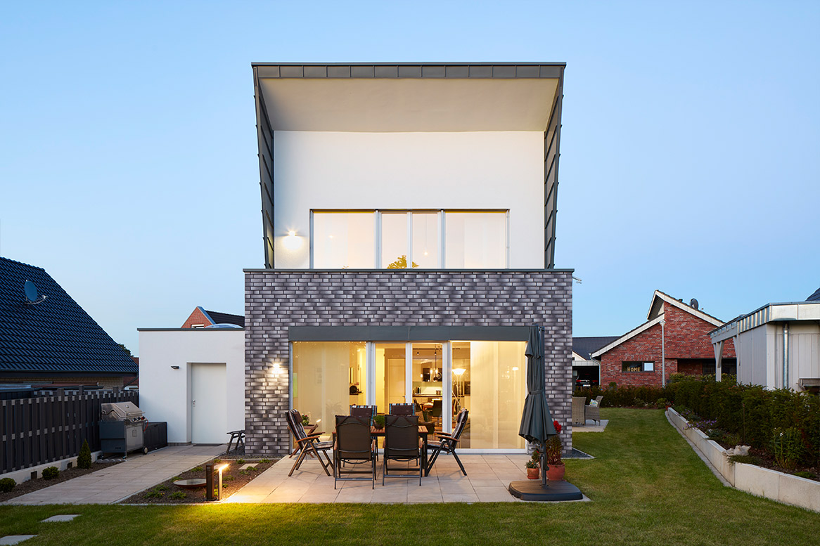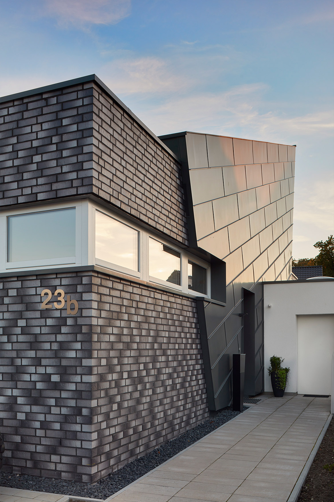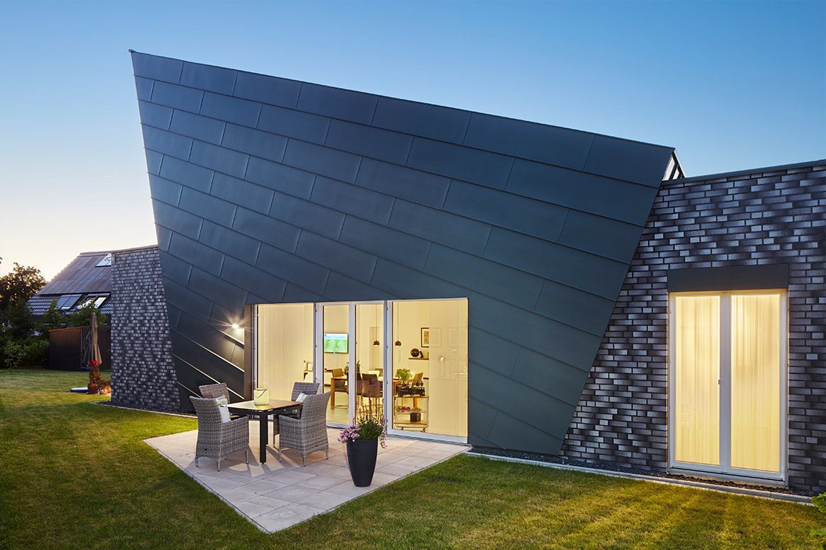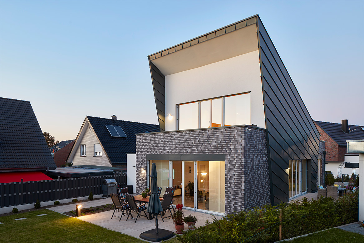 Im ersten Stock, unter einem extravaganten Pultdach mit einer Neigung von 19 Grad, gibt es noch ein Gästezimmer mit Bad und Sauna sowie einen Technik- und Abstellraum. Architektonisch bietet das Pultdach allein schon durch seine markante Akzentuierung einen angenehmen Kontrast zum rechteckigen Erdgeschoss. Die besondere Ausstrahlung wird durch eine seitliche Zinkblechverkleidung verstärkt, wobei der Stehfalz als gestaltprägendes Element parallel zur Dachneigung verläuft und die optische Wertigkeit des Hauses erhöht. Durch die spannende Materialkombination wird die Flächigkeit der verklinkerten Fassade aufgelöst und das außergewöhnliche Erscheinungsbild des Hauses harmonisch abgerundet.