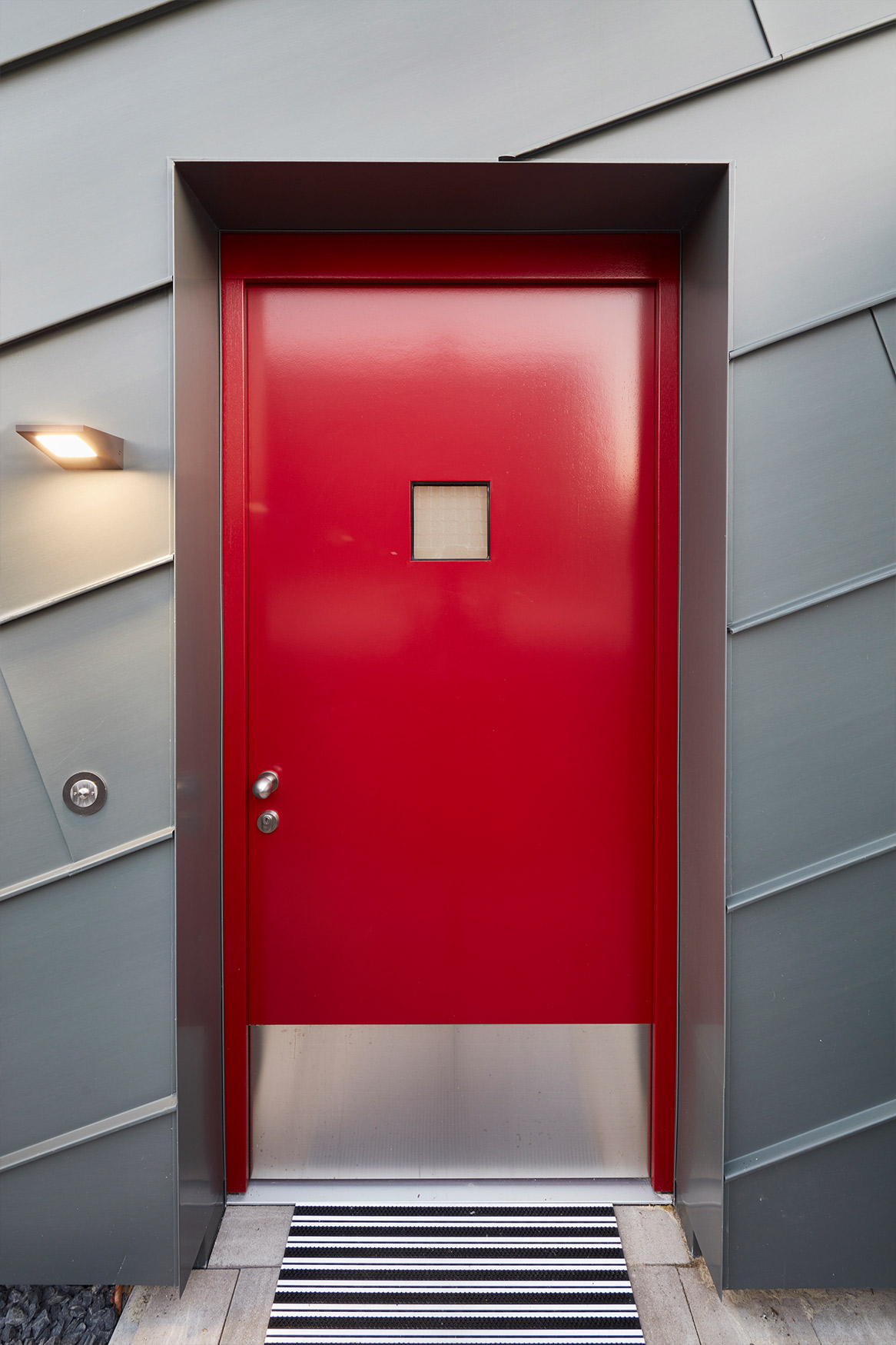 Schon beim Betreten des sechs mal 15 Meter großen Gebäudes spürt man die Reduktion auf das Wesentliche. Es gibt keine Eingangszone, keinen Windfang. Gleich hinter der rechts vom Eingang angeordneten Treppe befindet sich das Herz des Hauses: Ein heller und offen gehaltener Wohn-Ess-Koch-Bereich, der sich durch mehrere bodentiefe, dreifach verglaste Fenster zum Garten hin öffnet. Er bietet genügend Raum für kommunikatives Miteinander, wobei die Wohnküche mit einer modernen Kochinsel als Empfangsraum dient und den familiären Lebensmittelpunkt bildet. Links vom Eingang geht es in den Privatbereich mit Schlafzimmer, Bad und WC. Somit befinden sich alle wichtigen Räume im Erdgeschoss.