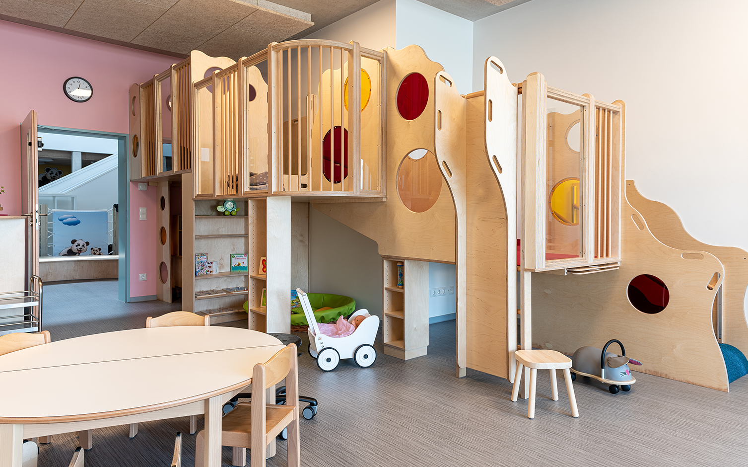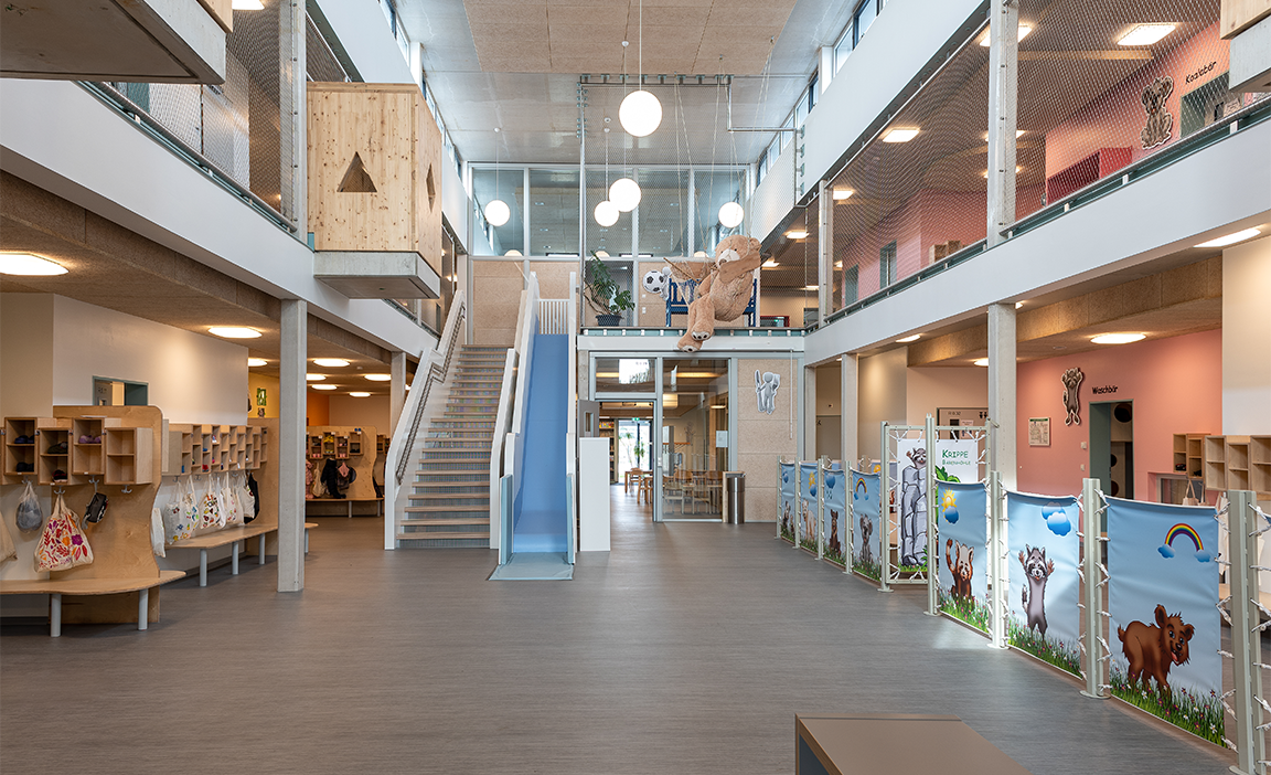 In den Fluren motivieren zahlreiche Sitzgelegenheiten und Verstecke sowie eine Rutsche, die parallel zur zentralen Treppe vom ersten Stock in das Forum führt, die Kinder zum Erkunden ihrer Umgebung. Außerdem wurde im Obergeschoss ein engmaschiges Edelstahlgewebe über die gesamte lichte Höhe gespannt, das als Absturzsicherung dient und zugleich eine Vielzahl an Blickbeziehungen eröffnet. Auch farbliche Gestaltung zeigt sich kindgerecht: Pastellfarben von Gelb und Orange über Rosa bis zu Grün und Blau schaffen eine warme, freundliche und farbige Atmosphäre, die zugleich beruhigend wirkt.
