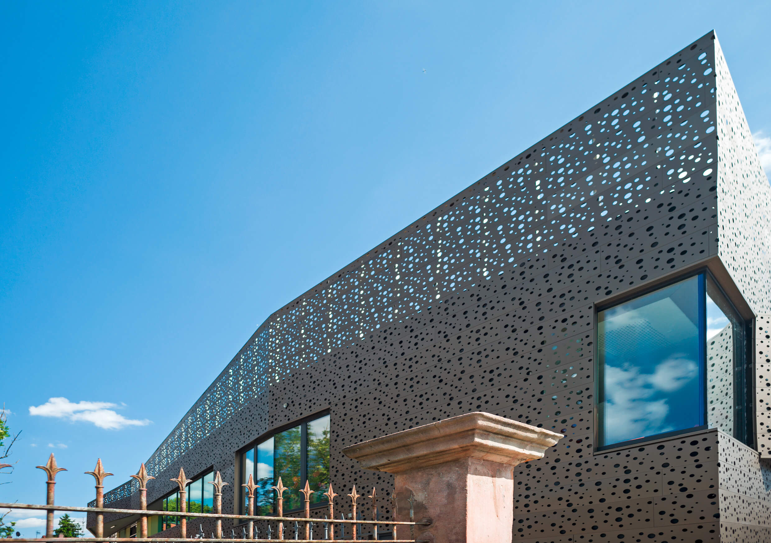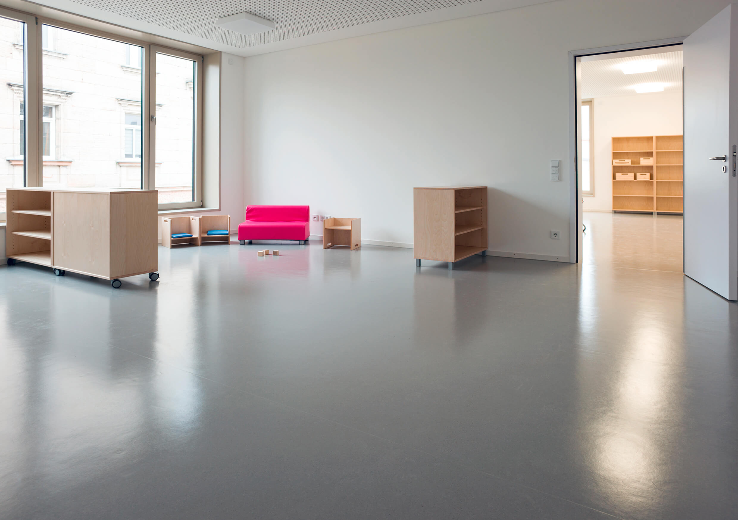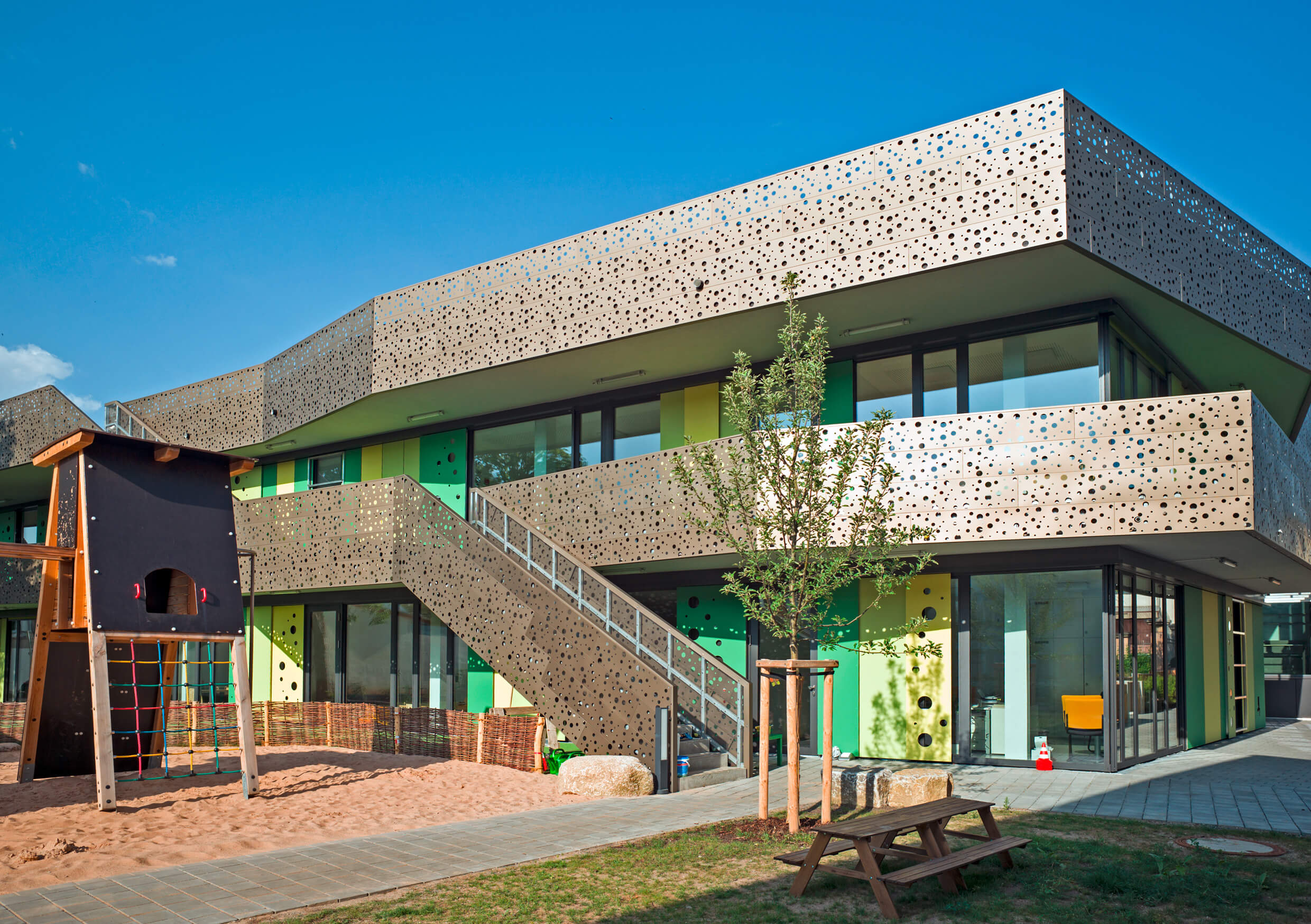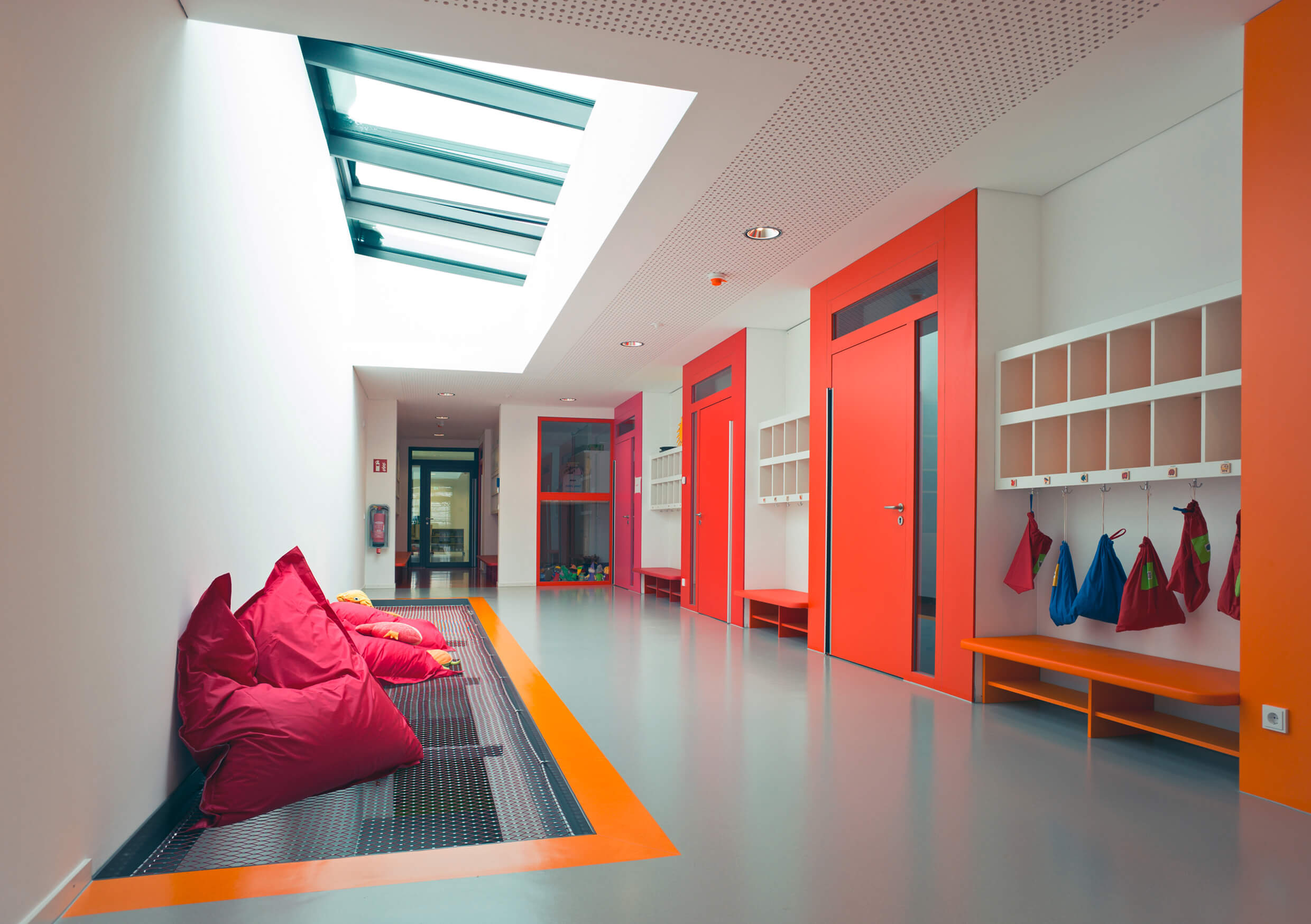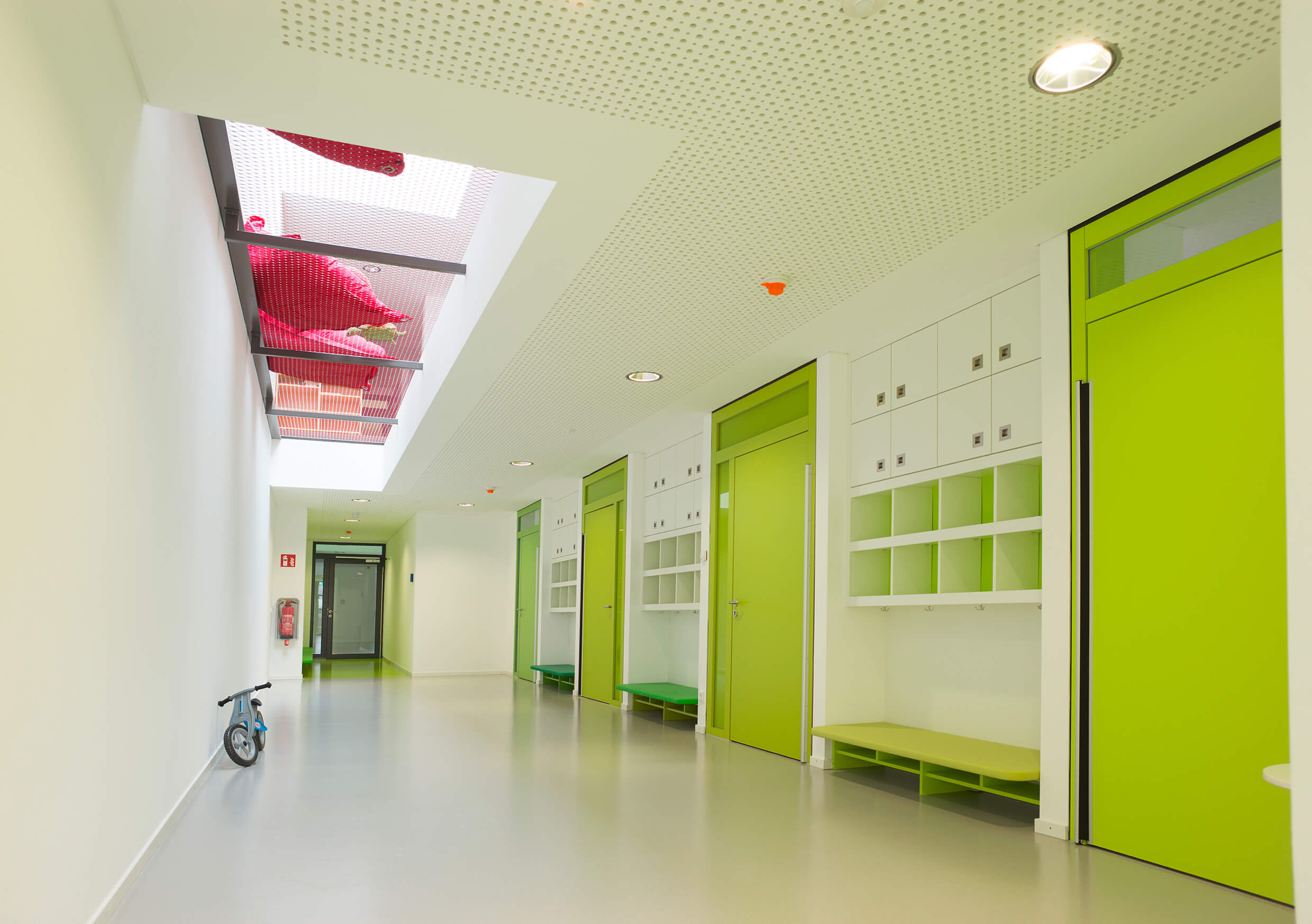 Eine freitragende Hängematte, die in die Deckenöffnung eingespannt wurde, ermöglicht den Kindern – als besonderes Highlight – den direkten Blick von oben in den Spielflur im Erdgeschoss. Dort öffnet sich das Gebäude zum Garten, während die Kindergartengruppen im Obergeschoss die Freiräume über einen Laubengang erreichen. Große Sitzfenster in den Gruppen- und Nebenräumen des Hortbereichs im Obergeschoss lassen große und kleine Besucher wie mit Monitoren nach draußen in den Schulbereich blicken.