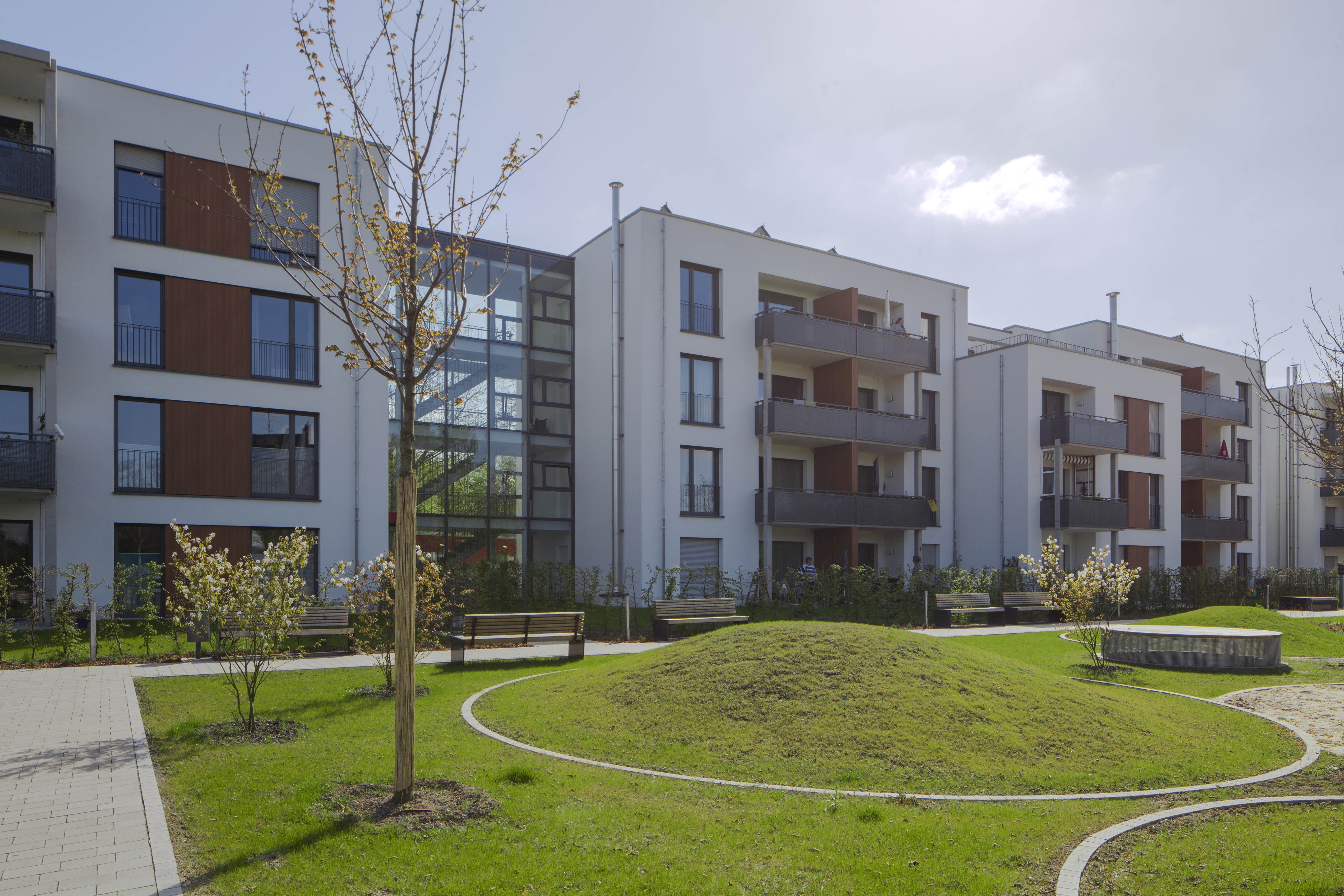 Die Baukörper gruppieren sich um einen weiträumigen Innenhof, der als Kommunikationszentrum von den Bewohnern sehr gut angenommen wird. Verschiedene Bereiche fördern die Nachbarschaft. Sie ermöglichen private und familiäre Begegnungen, laden zu Gesprächen ein und können auch für Quartierfeste genutzt werden.