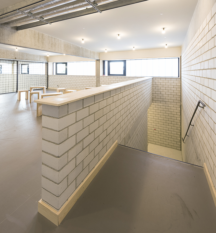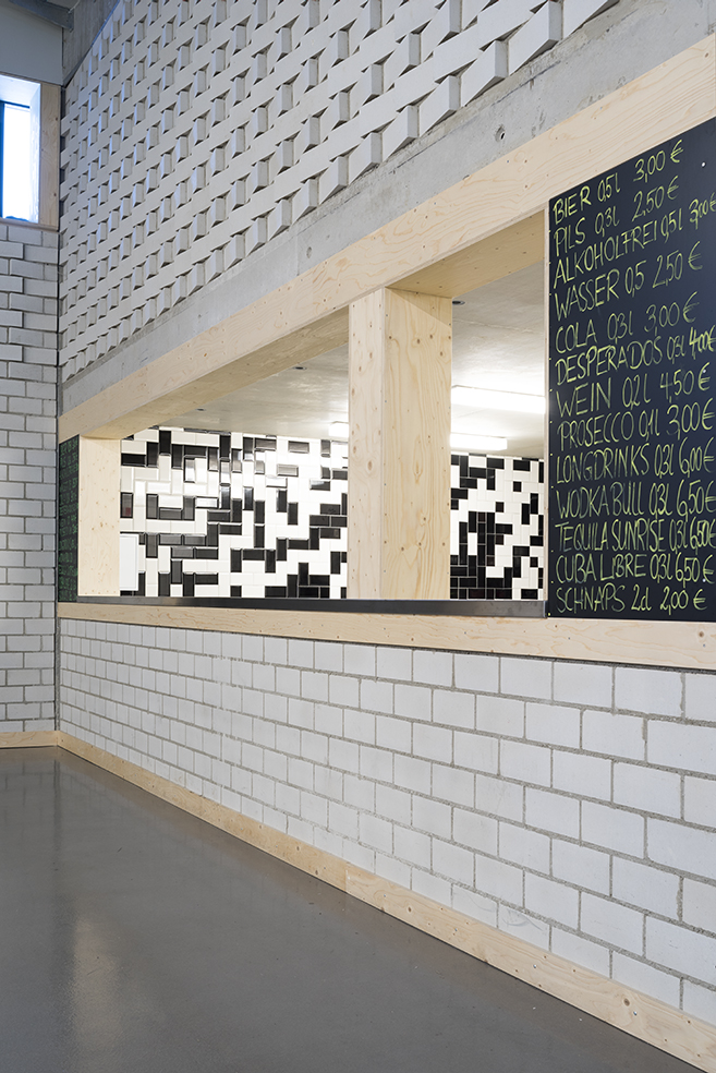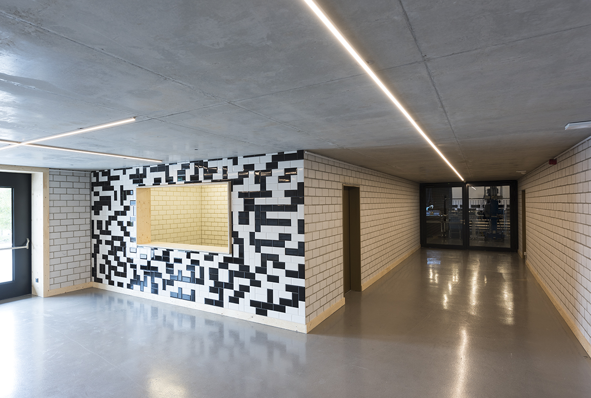 Ein besonderes Gestaltungsmerkmal sind die Ornamentfriese in der Veranstaltungshalle. Als Stilelemente verleihen sie dem Raum eine einzigartige Ästhetik. Darüber hinaus erfüllen Sie eine wichtige funktionale Komponente: die um eine Meterstabbreite gedrehten, plastisch hervortretenden Kalksandsteine brechen den Schall und sorgen so für eine optimale Raumakustik. Dadurch konnte auf weitere Aufwendungen zur Verbesserung der Akustik, wie die zusätzliche Einbindung von Schallsegeln oder anderen schallabsorbierenden Flächen, verzichtet werden. Die innovative und gestalterisch anspruchsvolle Anordnung des Innensichtmauerwerks ist somit die Basis für ein perfektes räumliches Musikerlebnis.