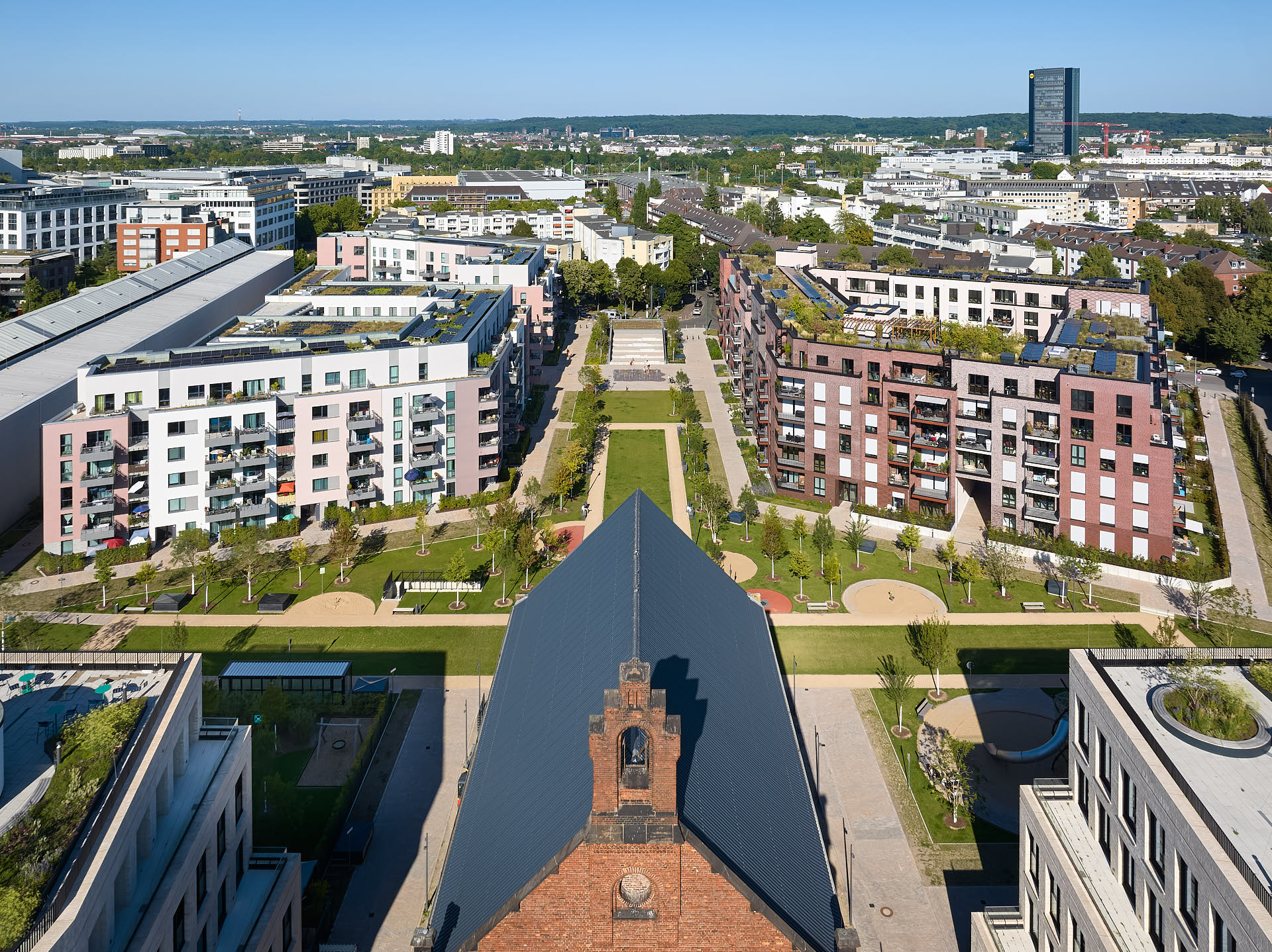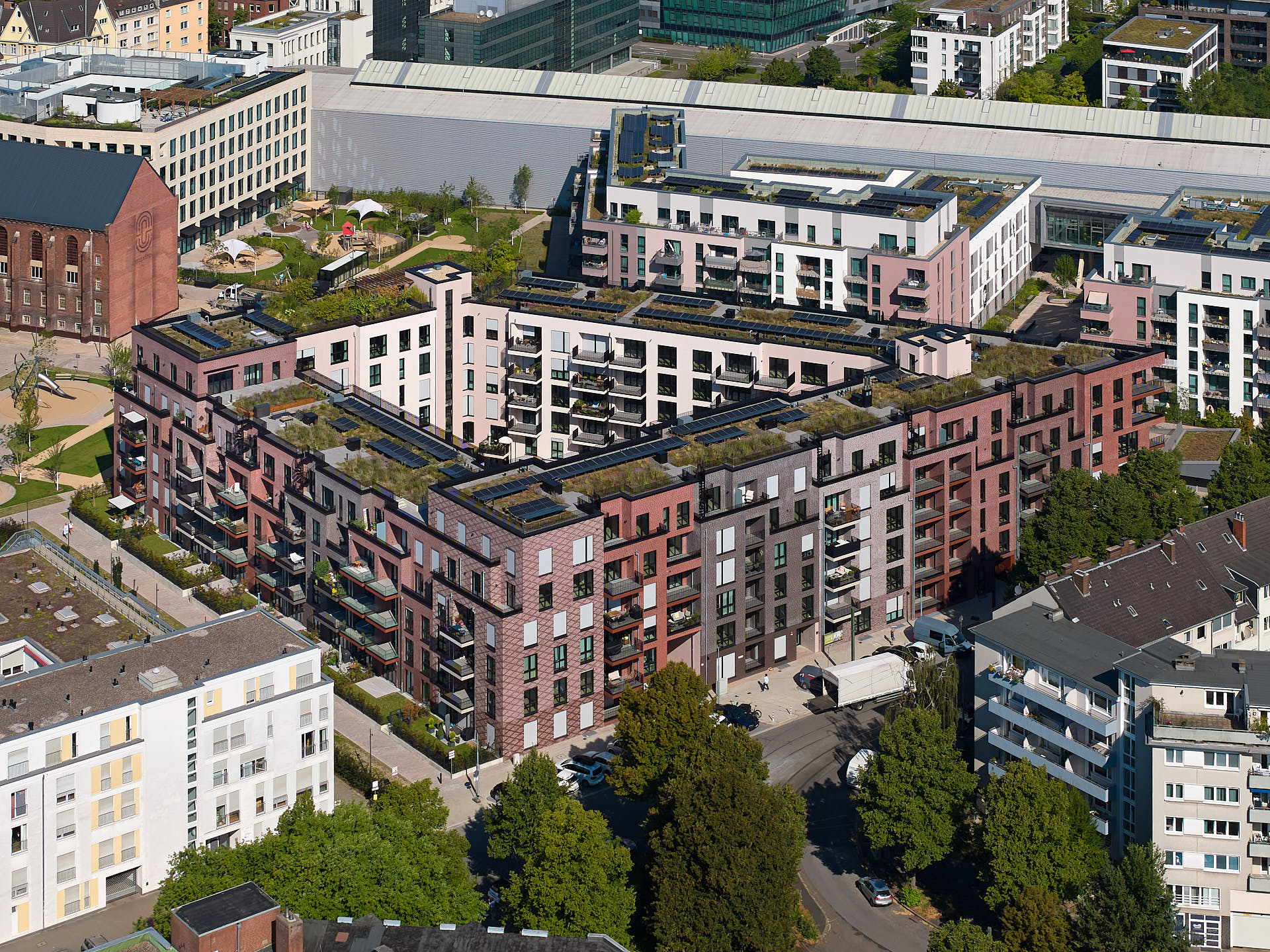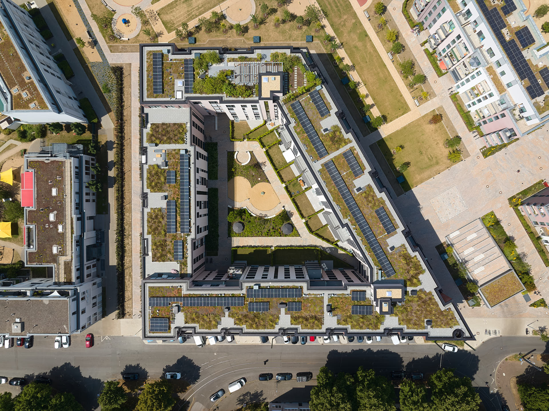 Auch funktional schöpfen die Gebäude aus einfachen, aber effektiven Prinzipien – wie etwa die umfangreich begrünte Dachlandschaft. Mit einer Substrathöhe von rund 40 Zentimetern nimmt sie nicht nur optisch Bezug auf die parkartige Erdgeschosszone, sondern wirkt wie ein Schwamm: Bei Starkregenereignissen verzögert sie den Wasserabfluss in die Kanalisation und entlastet so das städtische System. Die Retentionsfähigkeit der Begrünung ist Teil eines nachhaltigen Ansatzes, der das Gebäude auch im Klima von morgen funktionstüchtig hält.