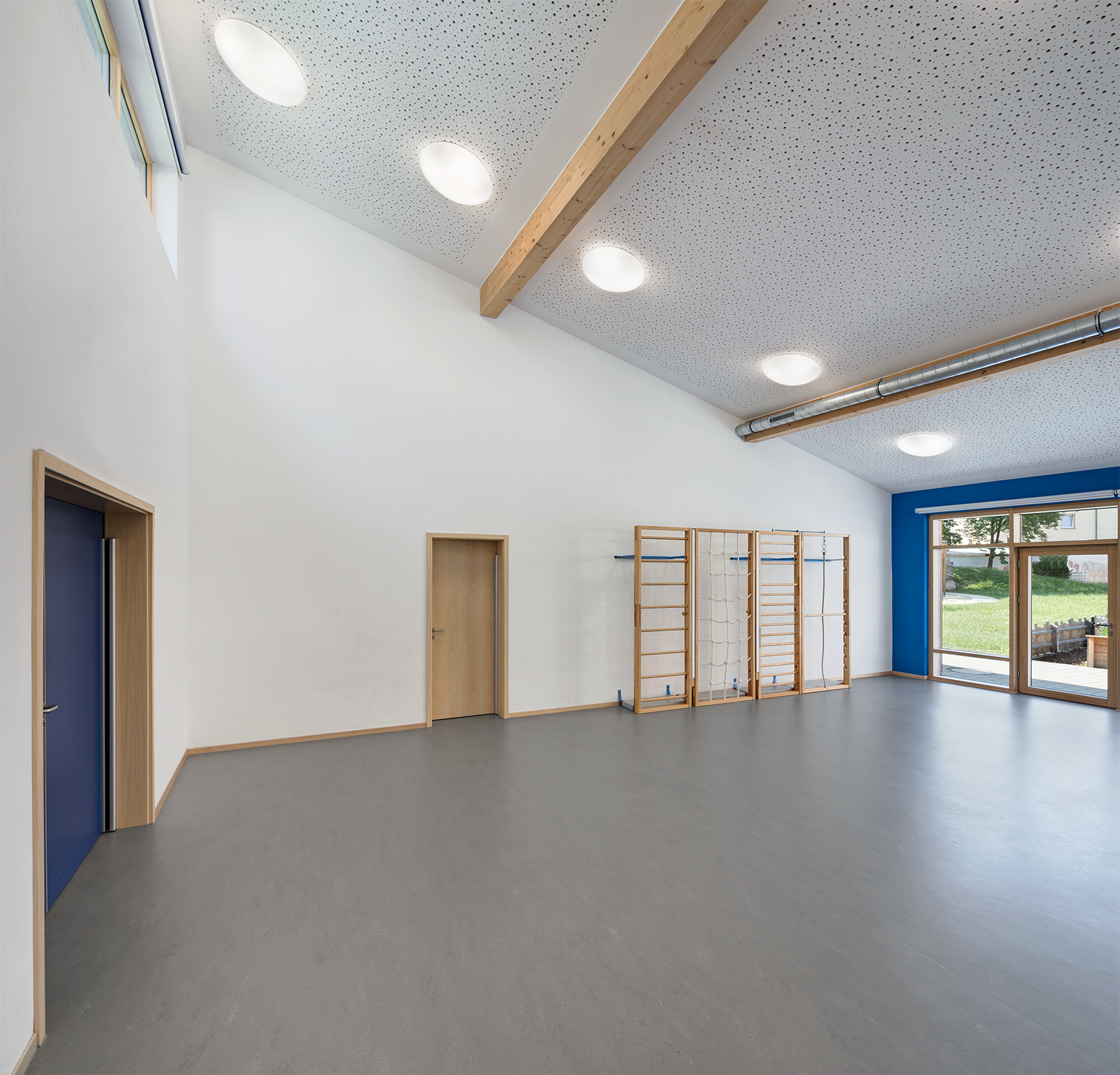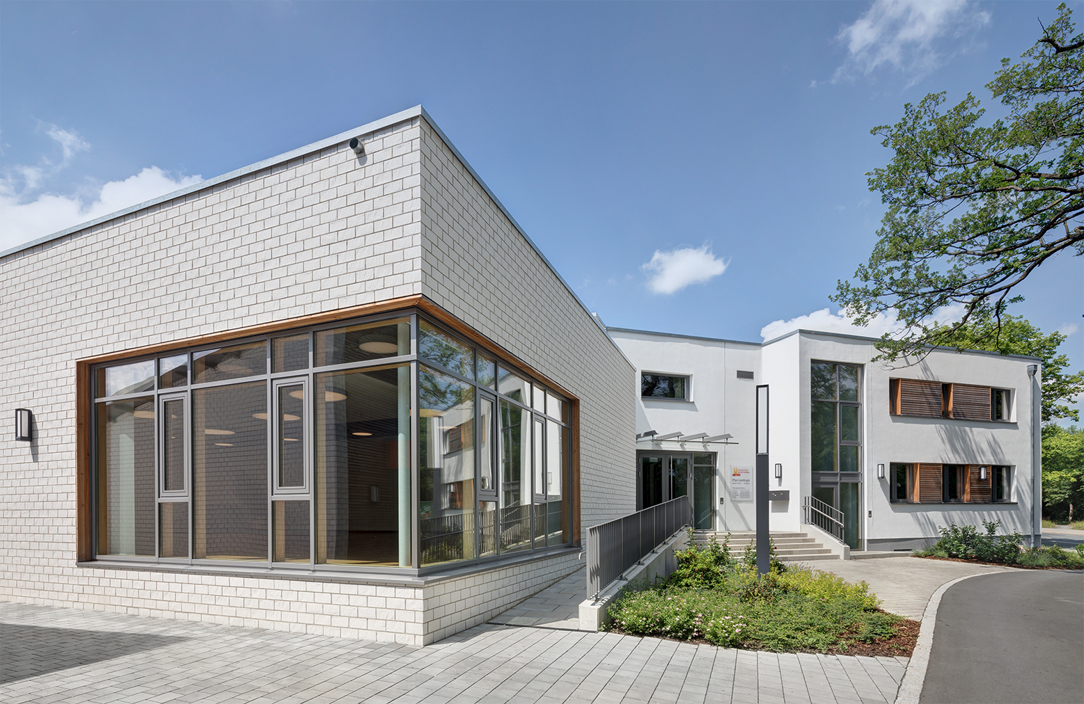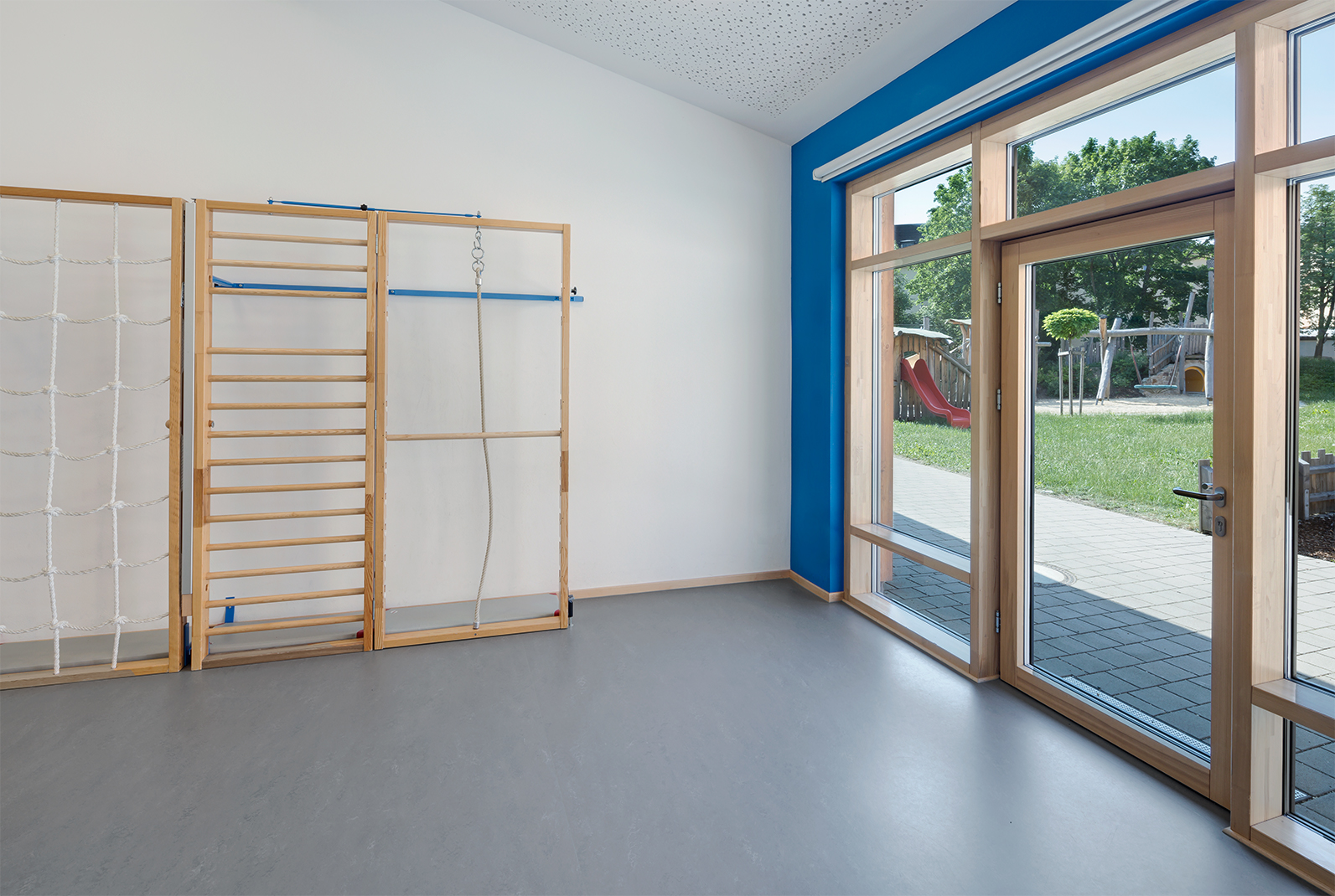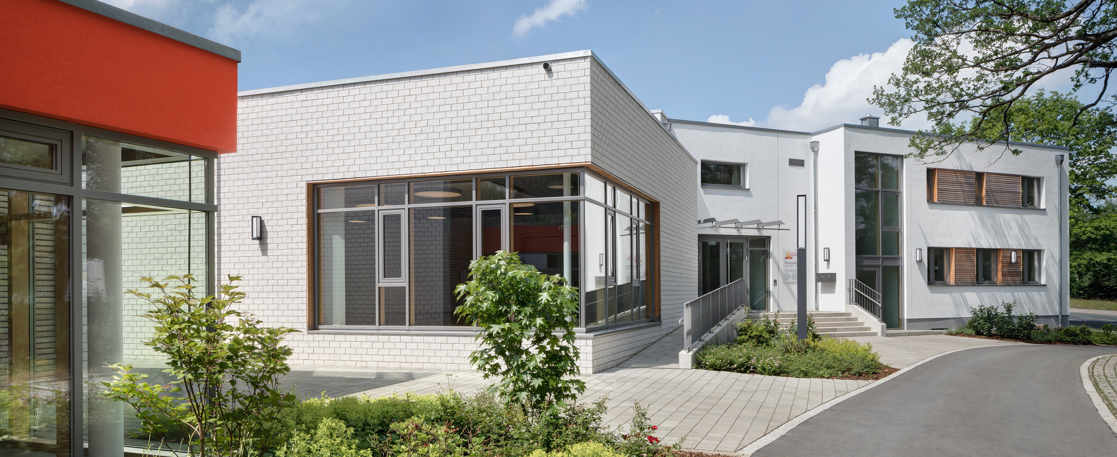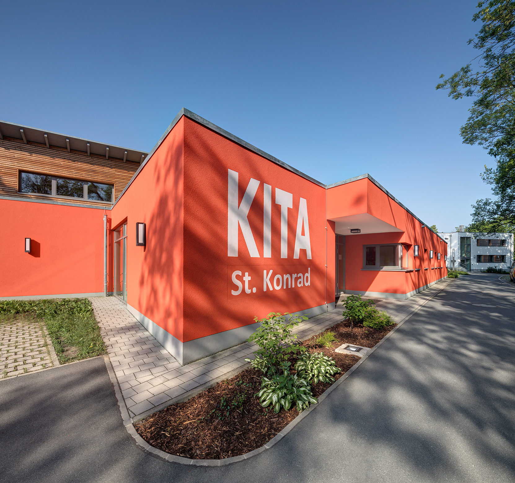Im Pfarrgarten der aus den 1950er Jahren stammenden Kirche St. Konrad wurde nach dem Abriss des ebenso alten Gemeindezentrums Platz für die Neubauten geschaffen. Nähert man sich dem Ensemble von Südosten über die Nailaer Straße, so fällt der Blick zunächst auf die „Kita St. Konrad“. Der langgestreckte Bau besteht auf der Straßenseite aus einem eingeschossigen und eher kantig gehaltenen Gebäudeteil mit Flachdach. Dort sind die Funktionsräume wie Büros, Technik, Küche und der Eingangsbereich angeordnet. Zum rückwärtigen Garten ist die Kita zweigeschossig und in einer leichten Bogenform mit Pultdach gehalten. In diesem Trakt befinden sich die Gruppenräume der Kindergartenkinder, die Krippenräume und ein Mehrzweckraum. Alle Kinderbereiche sind großzügig gestaltet mit unterschiedlichen Spielebenen und dank großer Fensterflächen lichtdurchflutet. Viele Farben und Materialien regen die Kreativität an.