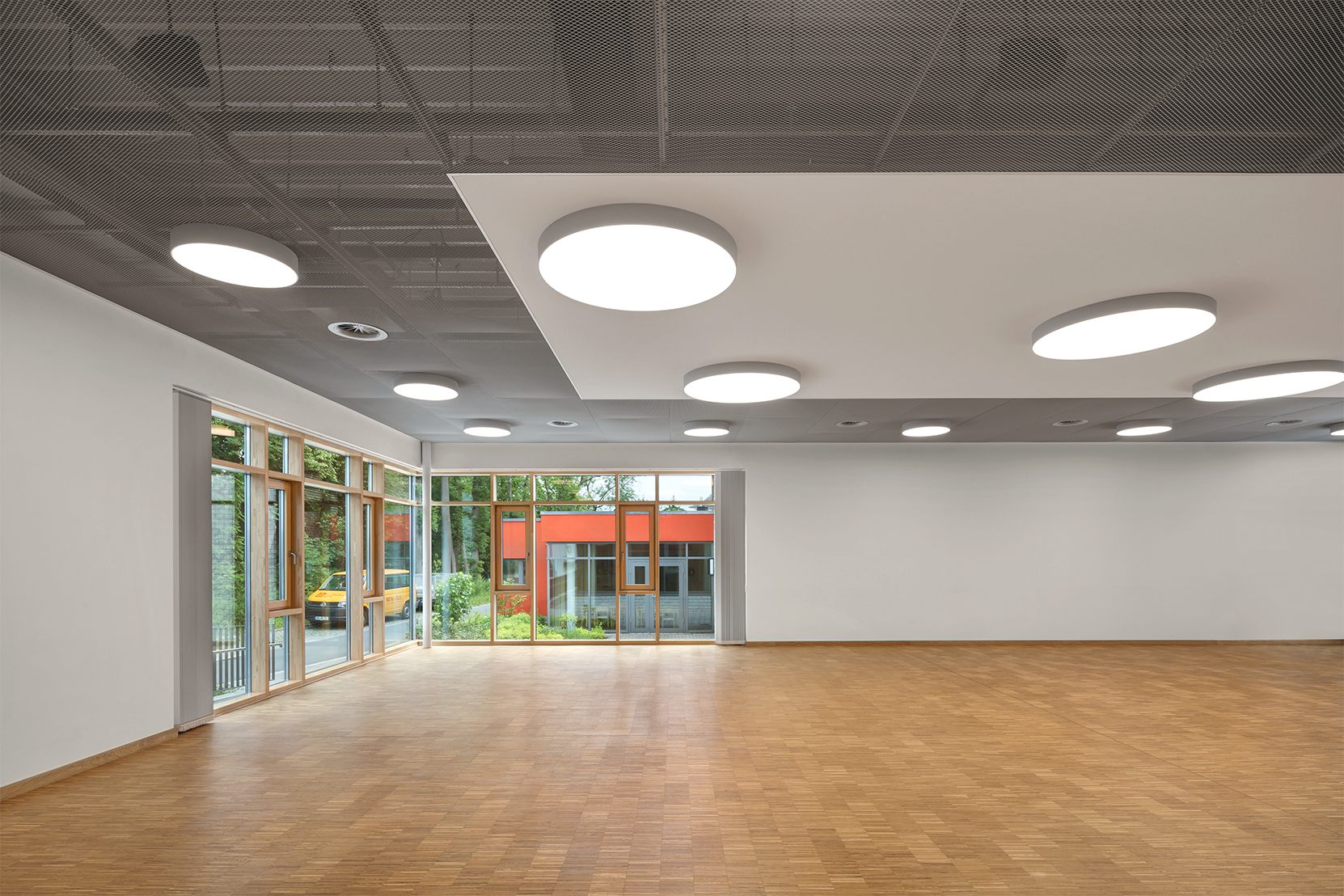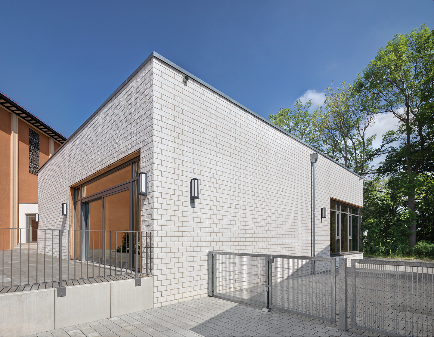 Folgt man der Nailaer Straße weiter, schließt das ebenfalls aus zwei Baukörpern zusammengesetzte Gemeindezentrum an. Der durch einen schmalen Durchgang von der Kita getrennte Nachbar besteht aus einem eingeschossigen quaderförmigen Veranstaltungssaal, der in einen Gebäudeteil mit zwei Etagen übergeht. Letzterer beherbergt neben Büro- und Konferenzräumen für die Gemeindeverwaltung auch Lagerflächen sowie eine Wohnung für den Pfarrer. Die farbliche Gestaltung, auch im 200 m² großen Pfarrsaal, ist auf Weiß und Grautöne reduziert, kombiniert mit Holz, sodass alle Räume auch unterschiedlich genutzt werden können.