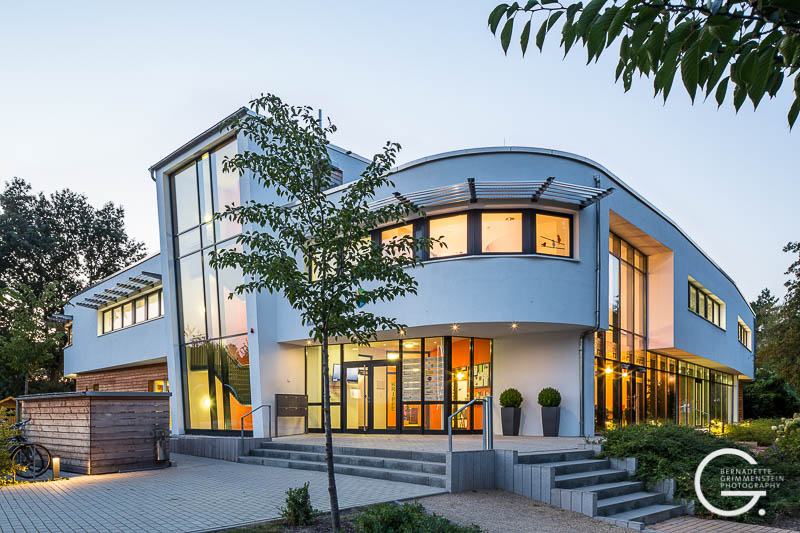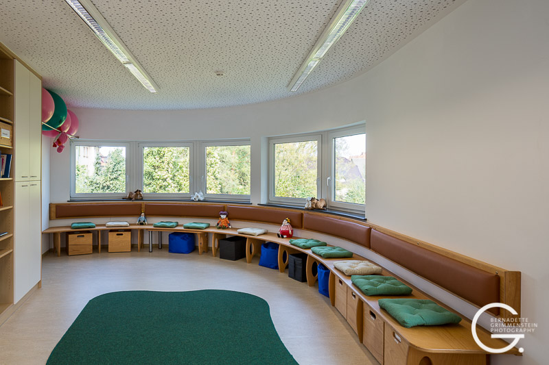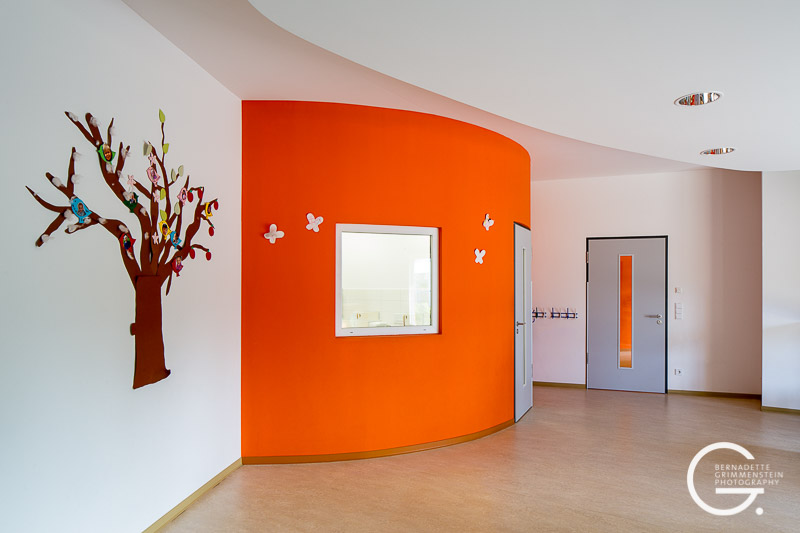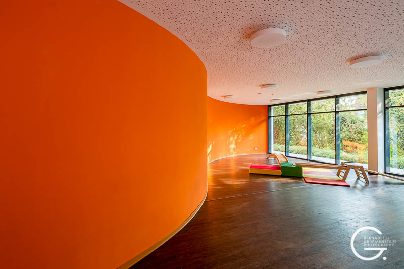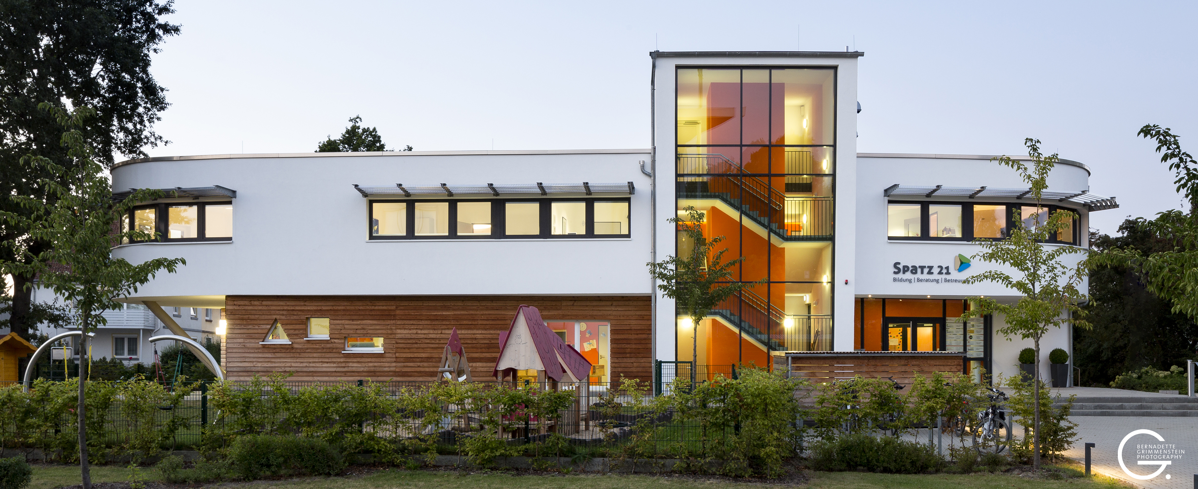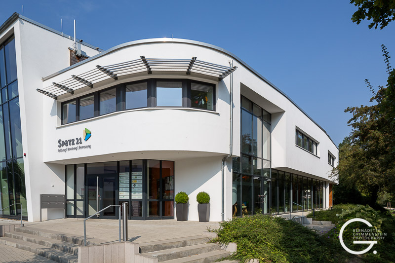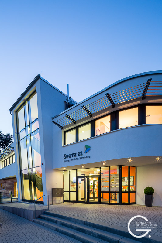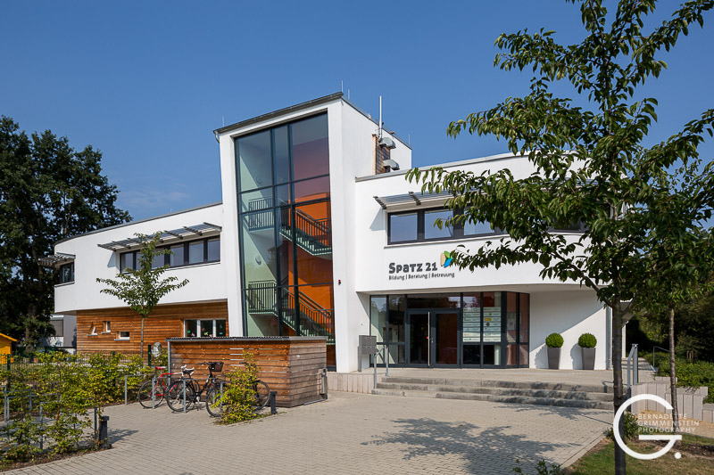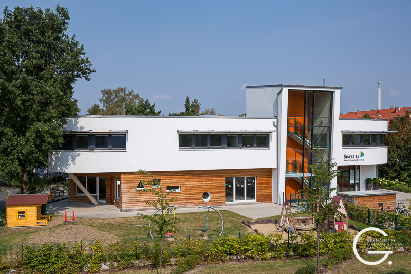 Das Besondere an diesem barrierefreien Zentrum ist das Zusammenspiel unterschiedlicher familienorientierter Einrichtungen. Das massiv errichtete Gebäude überzeugt durch eine schon fast elegant wirkende Leichtigkeit und Offenheit sowie die wohlproportionierten Anordnungen der einzelnen Bereiche, die in dem Familienzentrum mit dem wohlklingenden Namen „Spatz 21“ beherbergt sind. Dazu gehören eine Kinderkrippe für Kinder im Alter von 1-3 Jahren, das Café „Spatz“ und ein Mehrzweckraum sowie das Familienzentrum mit Beratungs- und Fortbildungsräumen und eine kleine Musikschule.