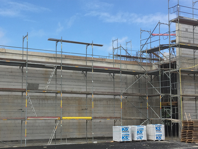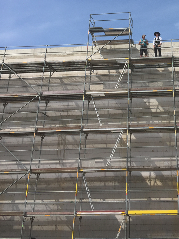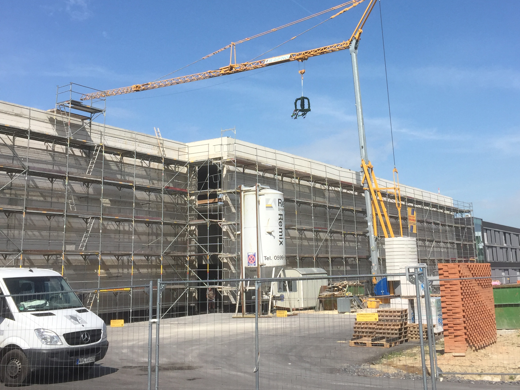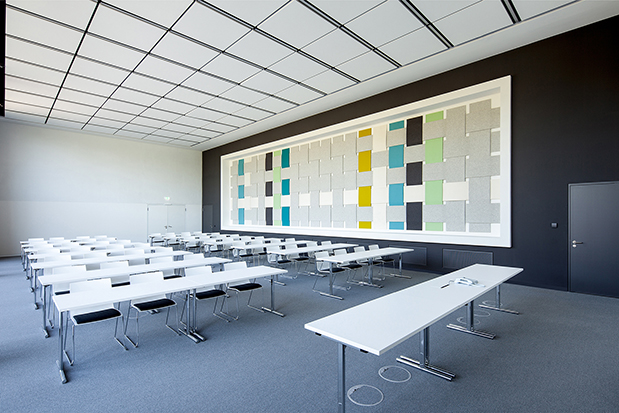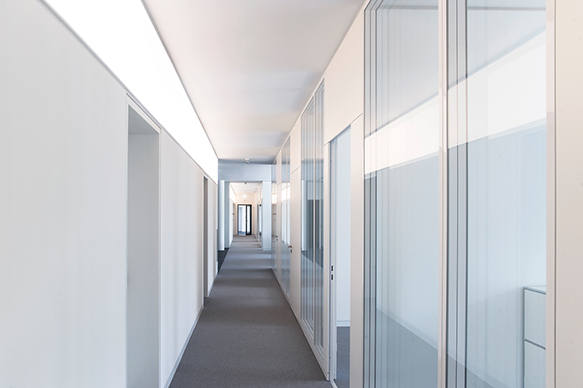 Die Fassade fasst den langgestreckten Baukörper zum Osten, Süden und Westen vollständig ein. Lediglich gen Norden öffnet sich der Neubau mit einer Glasfassade, die eine wunderschöne Aussicht in den angrenzenden Friedenspark mit seinem kleinen See bietet. Diese Ausrichtung schafft zugleich die Voraussetzungen für ein energetisch optimiertes Bürogebäude mit der Energieeffizienz eines KfW-Effizienzhaus 55 und einem Jahres-Heizwärmebedarfs von 76 kWh/m2a.